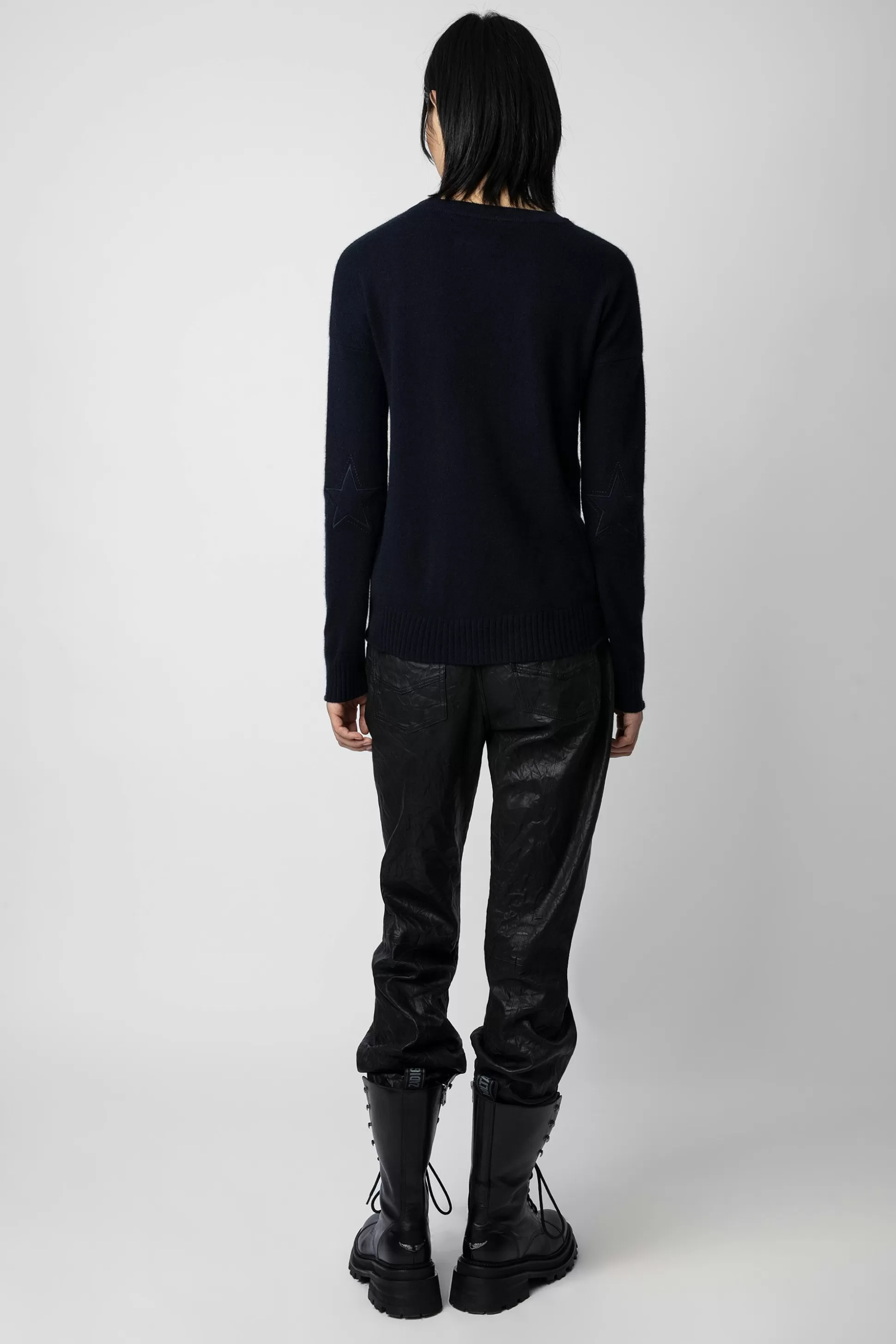 Pull Femme Encre En Cachemire Bleu Marine – Patchs Étoiles Brodés Sur Les Coudes – Encolure Ronde – Signature Pointell…