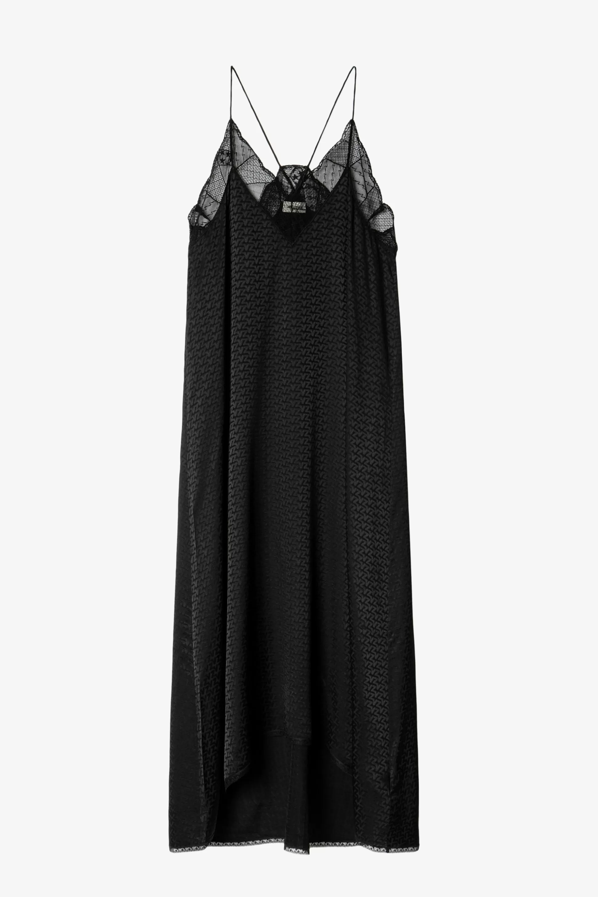 – Robe Longue Femme En Soie Noire – Monogramme Zv – Col V Orné De Dentelle – Bretelles Fines – Bas Fluide Et Asymétriq…