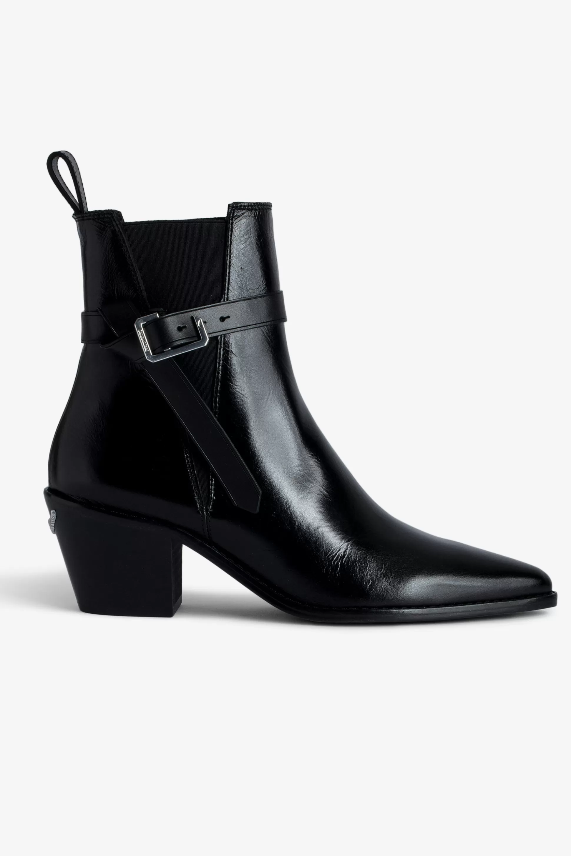 Bottines Femme En Cuir Noir Effet Vintage – Bride Réglable Avec Boucle C En Métal – Patte Arrière Et Côtés Élastiq…
