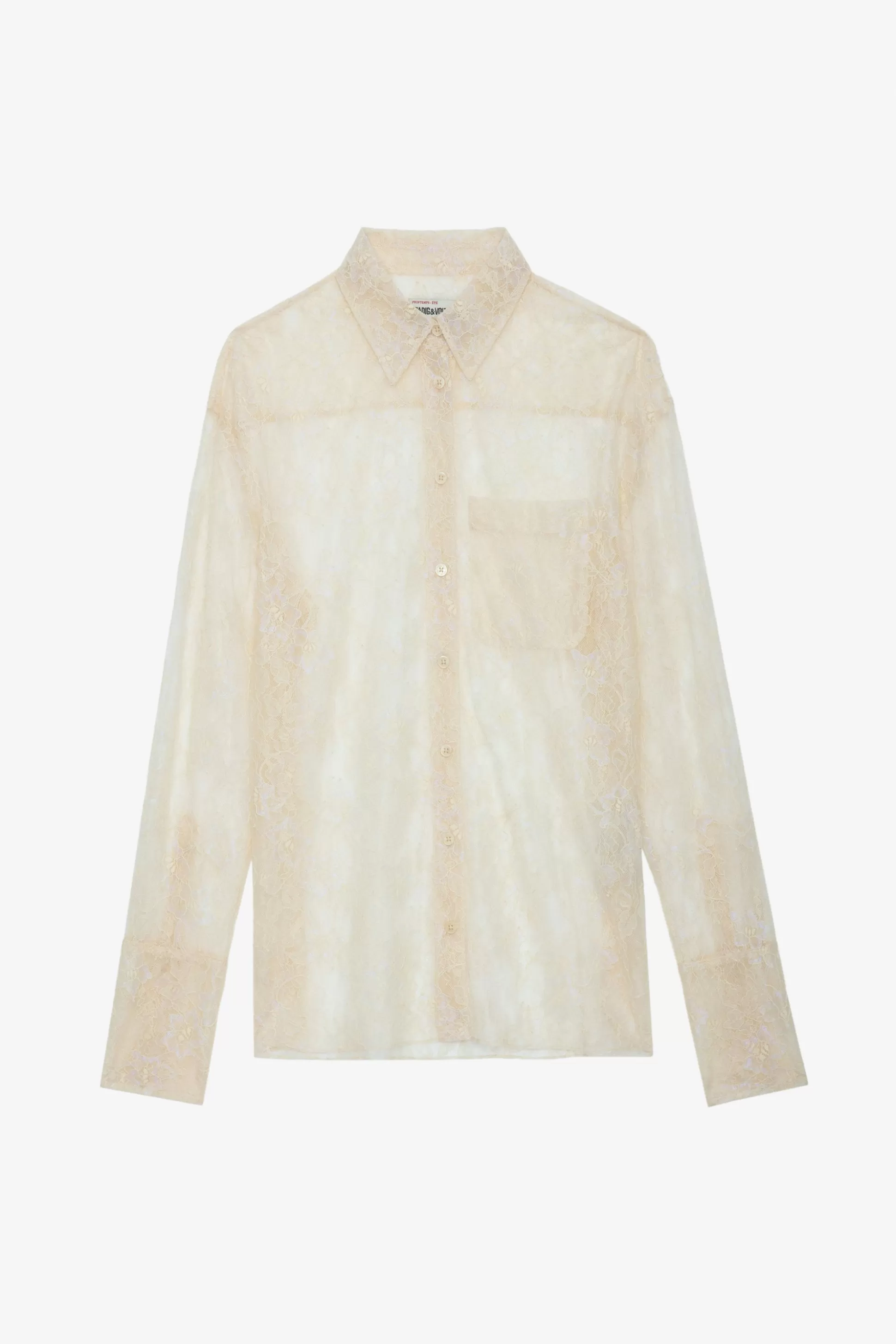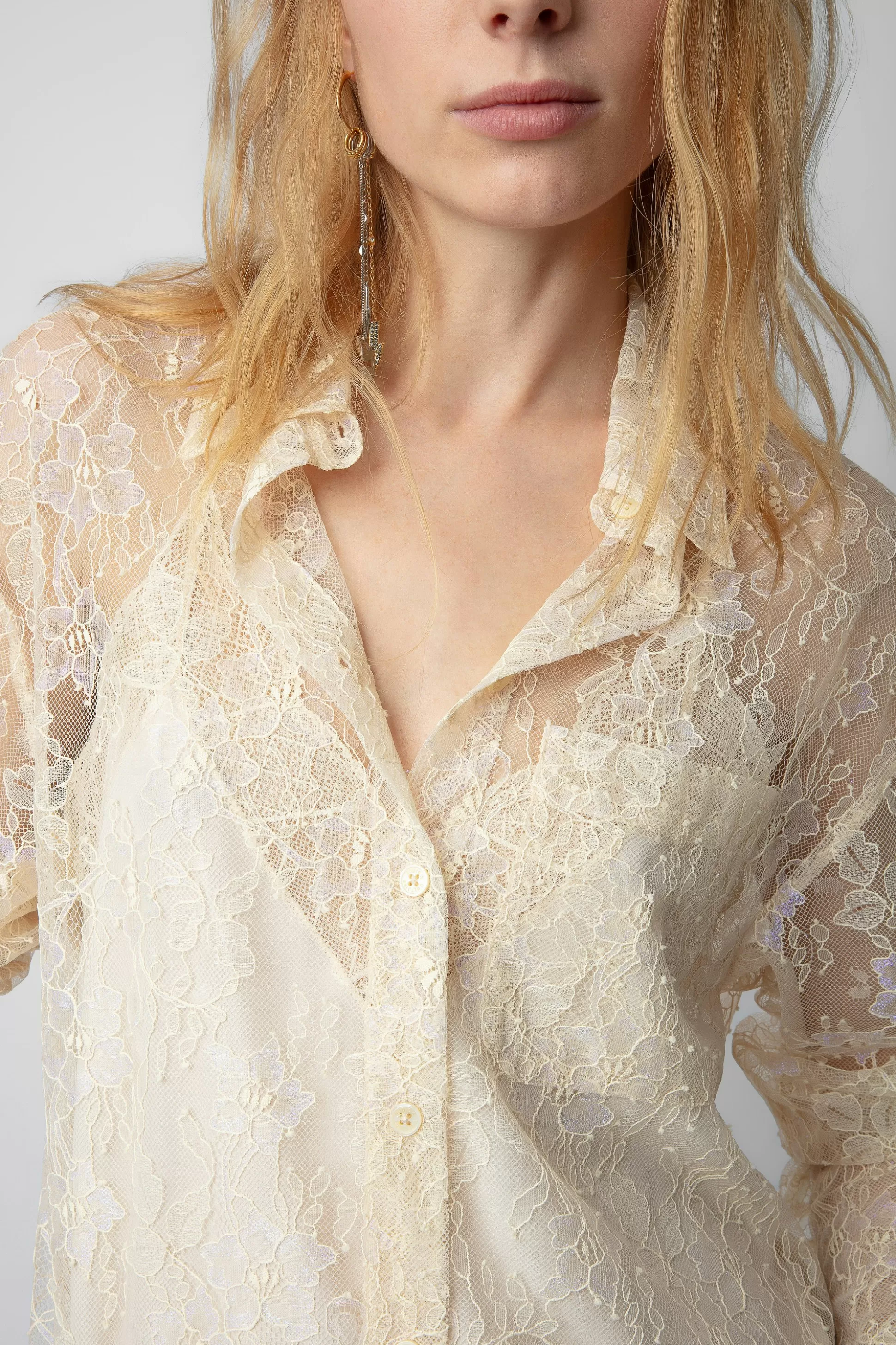 – Chemise Longue Esprit Lingerie Scout Écru – Coupe Masculine – Dentelle Irisée À Motif Floral – Col Chemise Et Ferme…