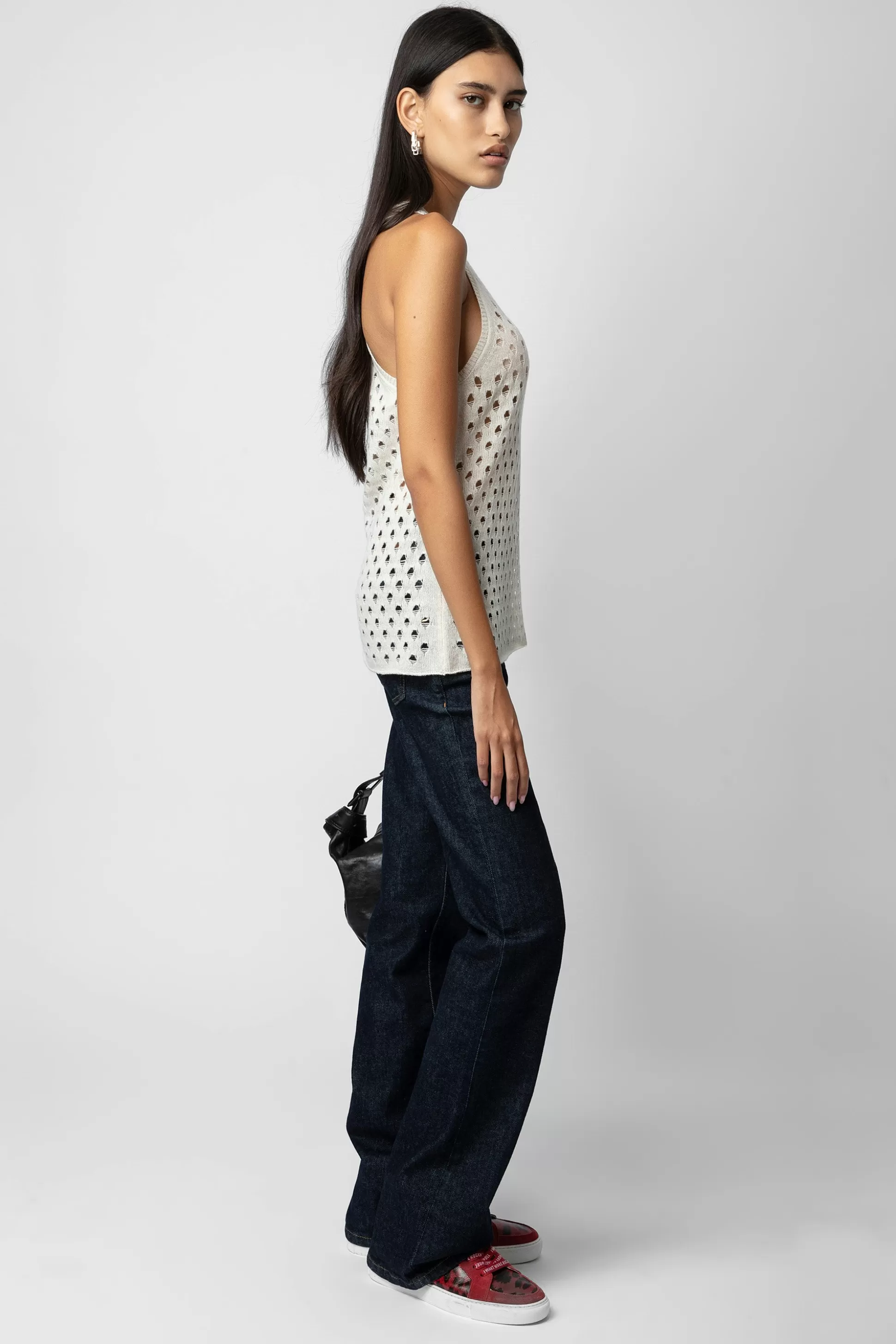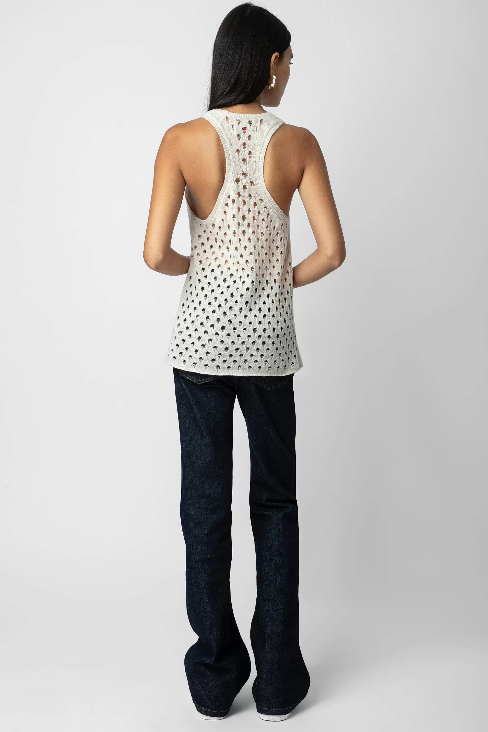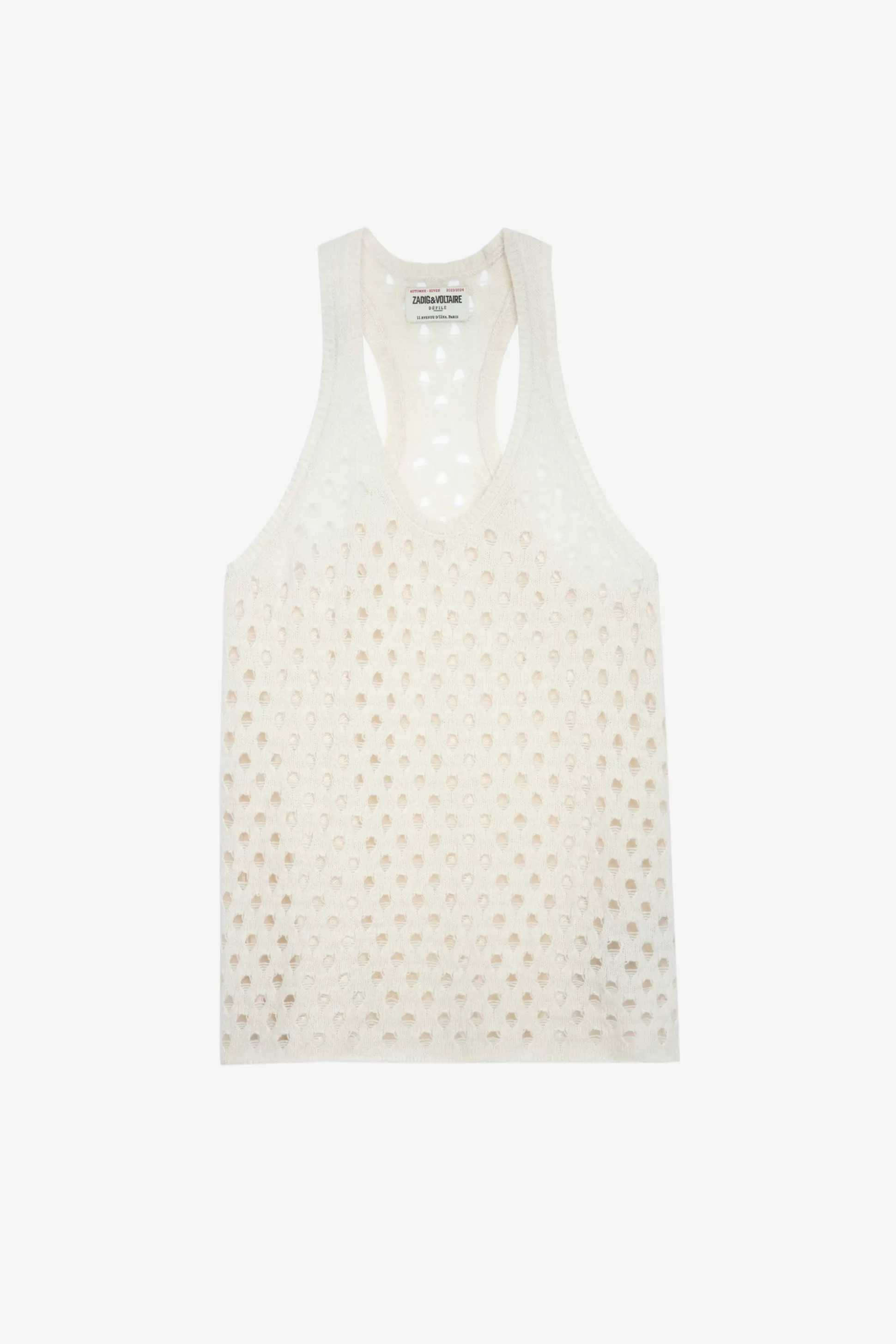 – Débardeur Femme Blanc Cassé En Maille – Ajouré Effet Vieilli – Col Rond – Emmanchures Découpées