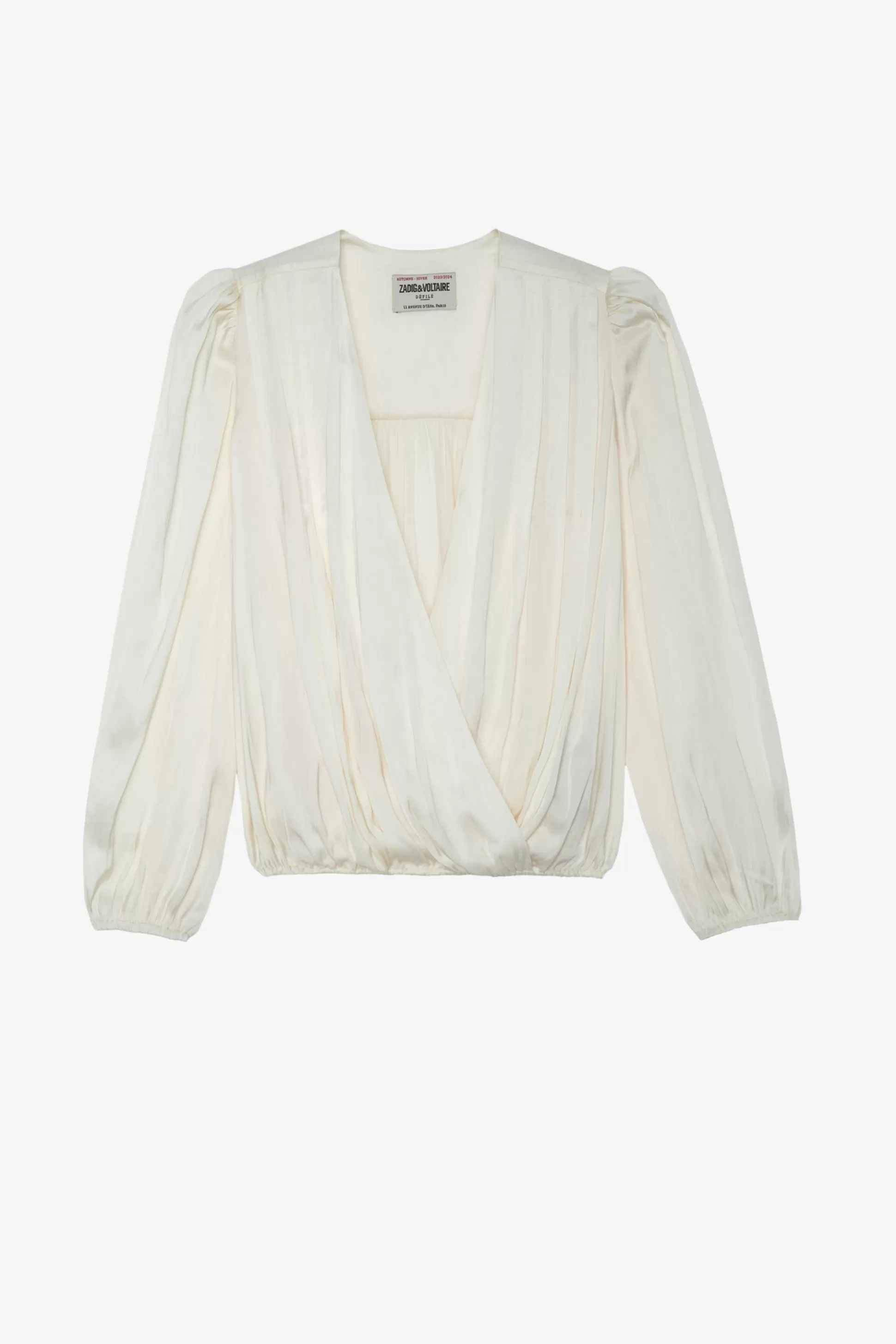 – Top Court En Satin Écru Sugar – Décolleté Cache-Cœur – Détails Drapés Et Froncés – Manches 3/4 Et Poignets Ress…