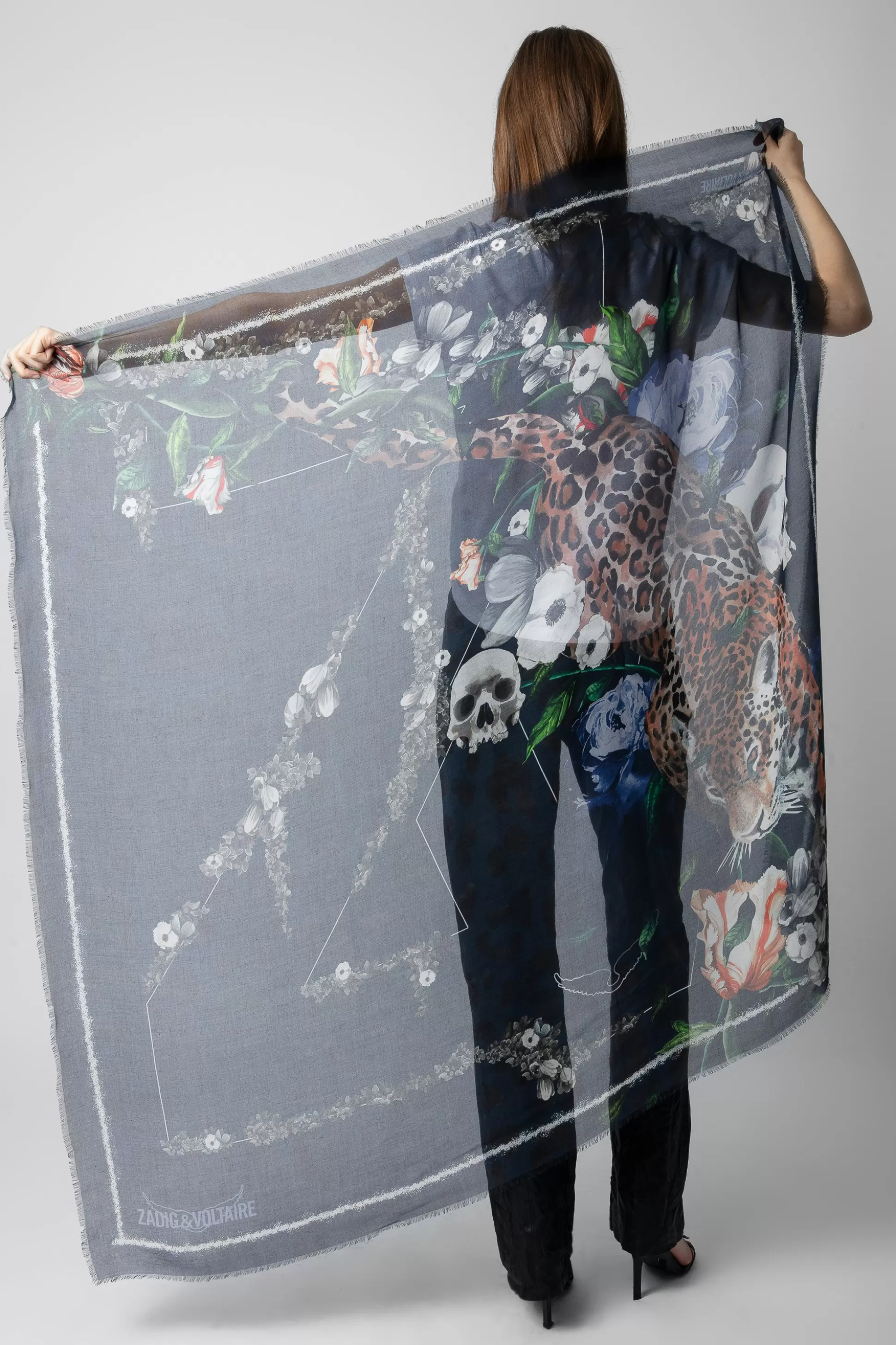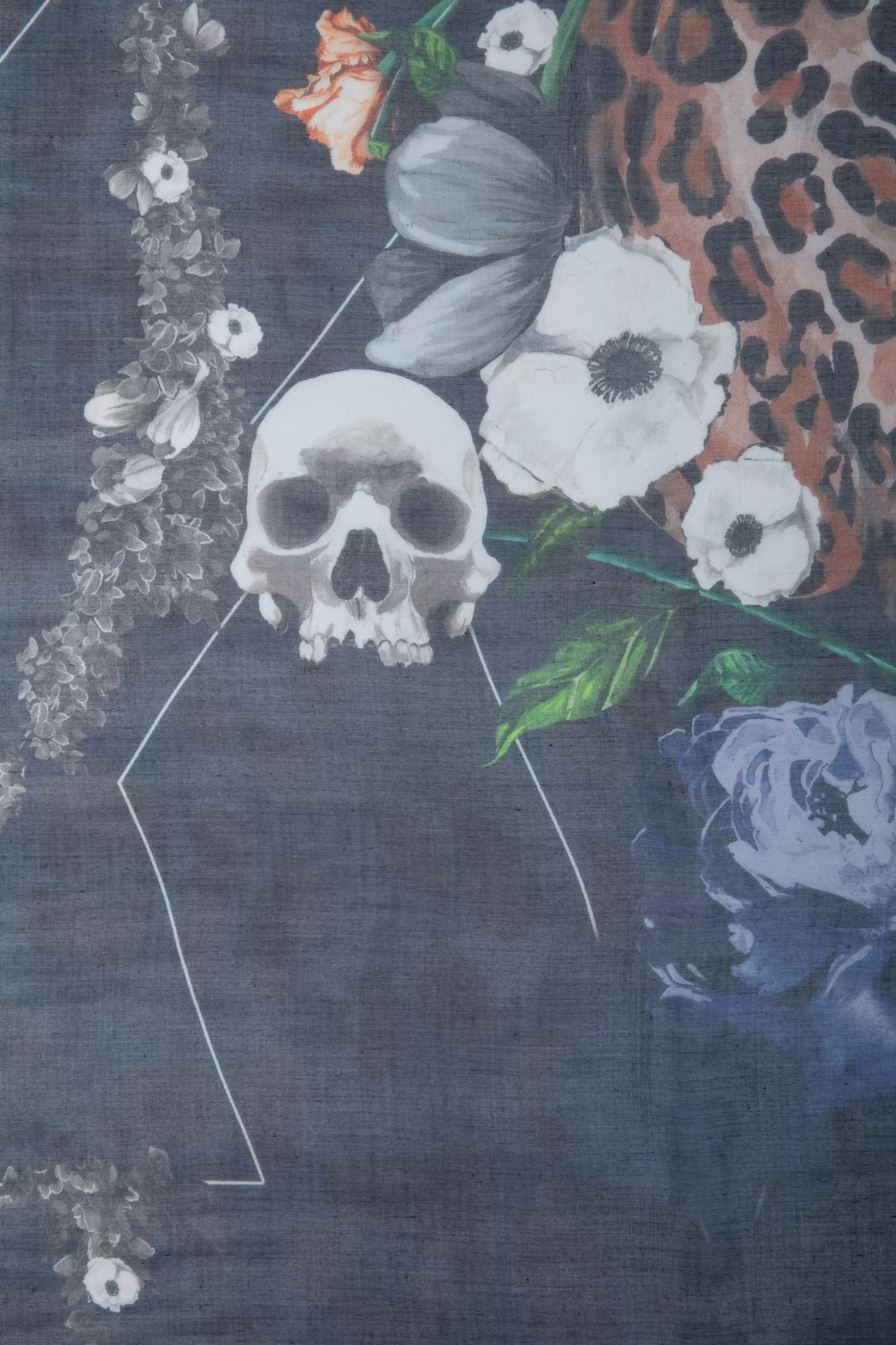 – Écharpe Ink Bleu Marine Pour Femme – Imprimé Sauvage, Floral Et Tête De Mort Et Signature Zv – Bordure À Franges -…
