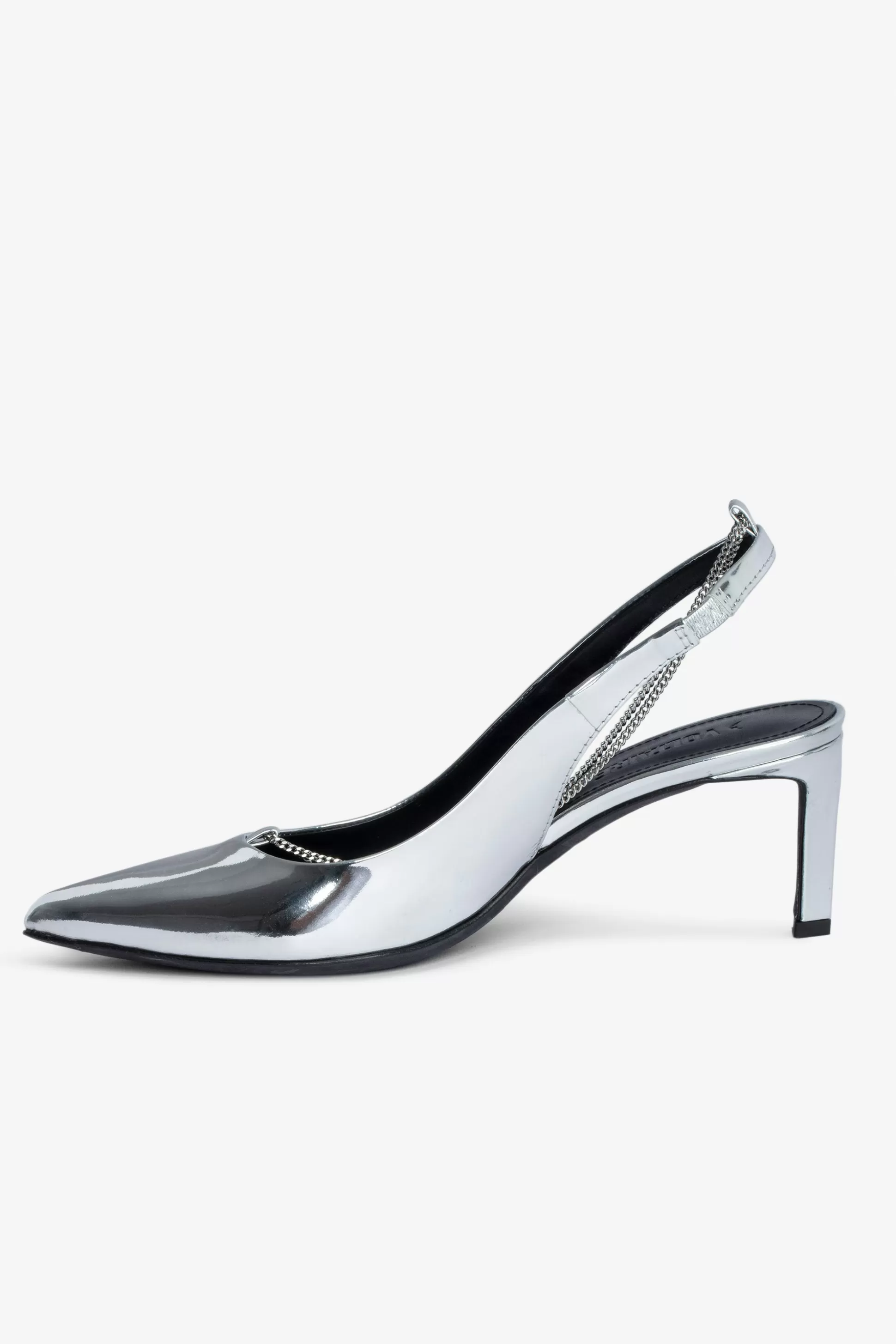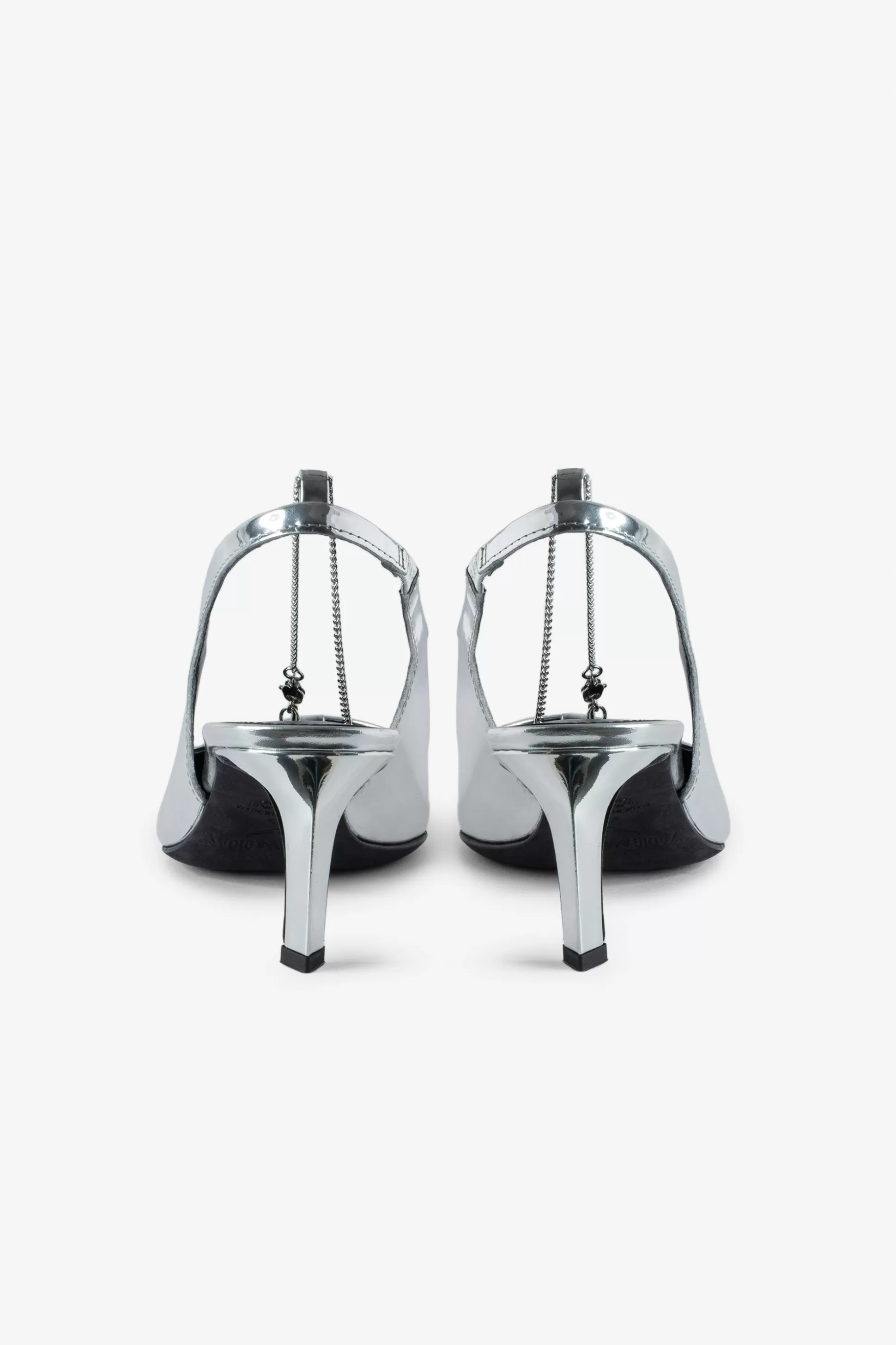 – Escarpins Femme En Cuir Verni Argenté – Bride En Cuir Et Chaîne En Métal Argenté Avec Breloque Ailes – Hauteur Du …