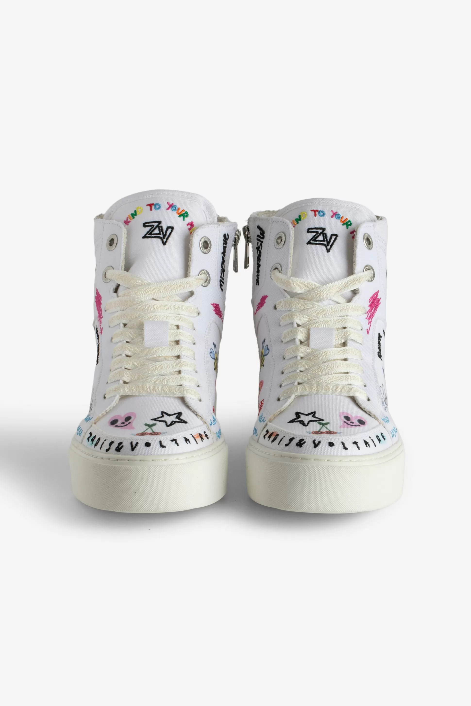 – Baskets Montantes Pour Femme En Toile Blanche Avec Lacets Et Zip – Surpiqûres Éclair – Détails Personnalisés Conç…