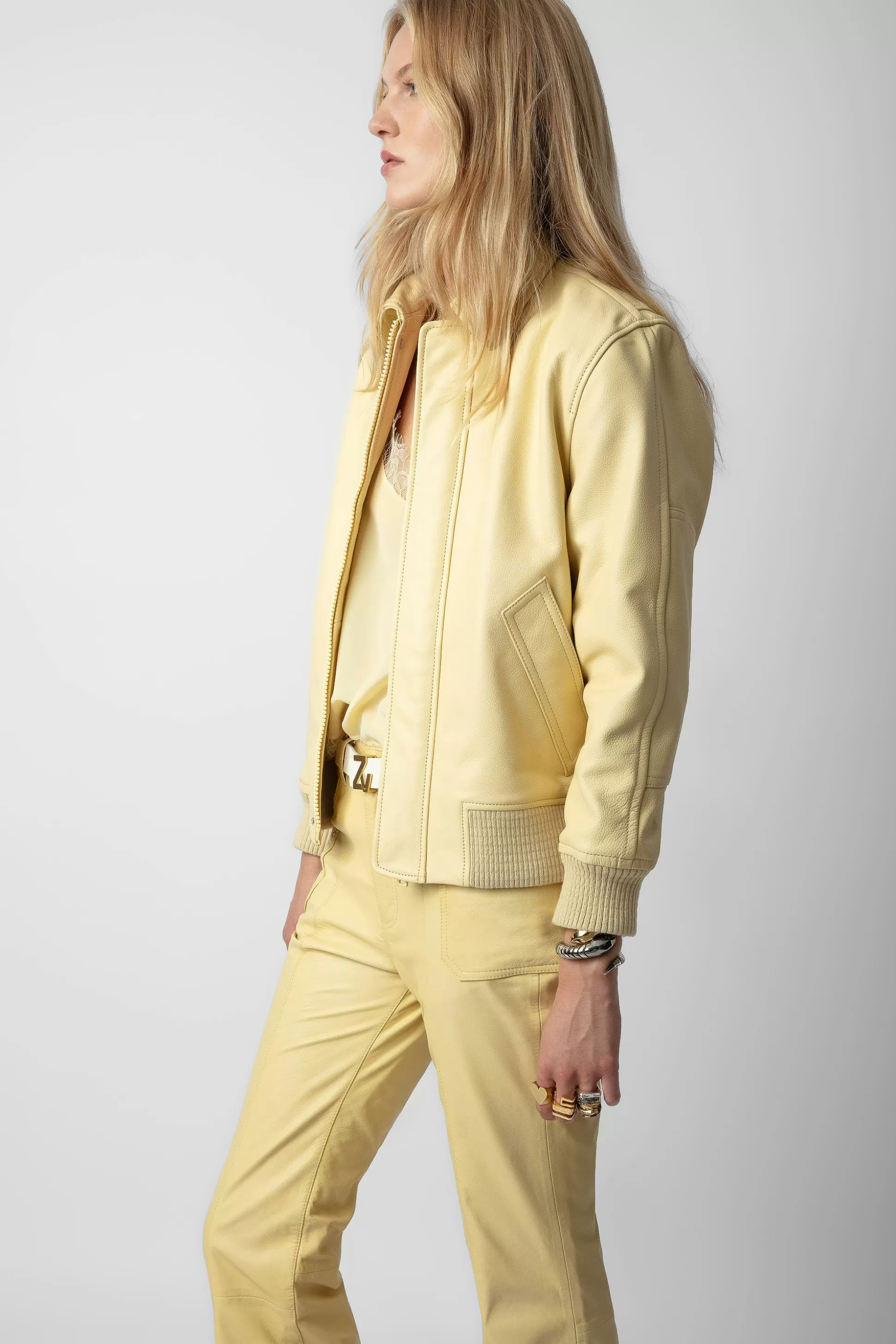 – Blouson Femme Oversize En Cuir Grainé Jaune Clair Shea