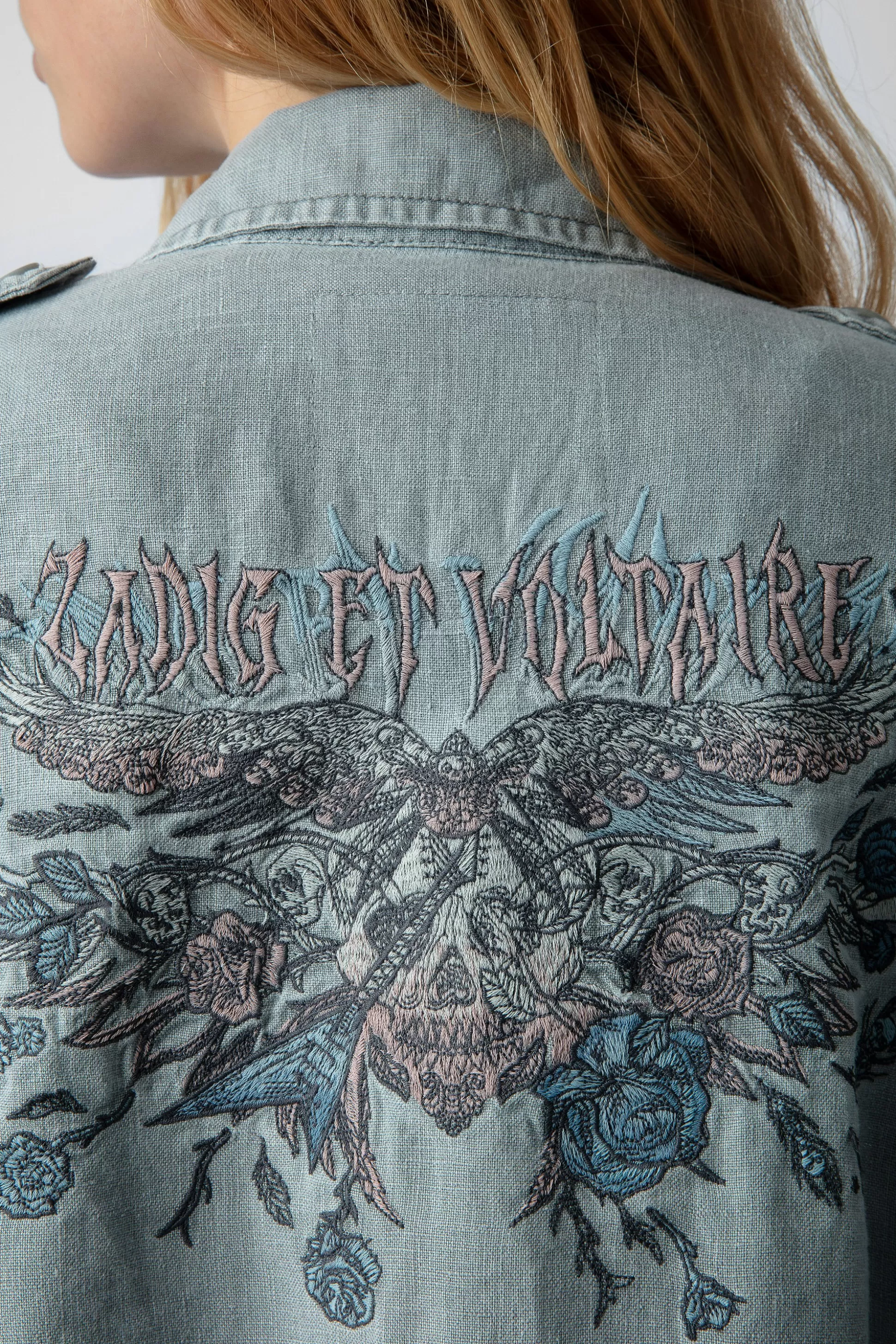 Veste Militaire Femme Glacier En Lin Bleu Ciel – Empiècement Contrasté Et Motif Ailes Et Tête De Mort Au Dos – Col Ch…