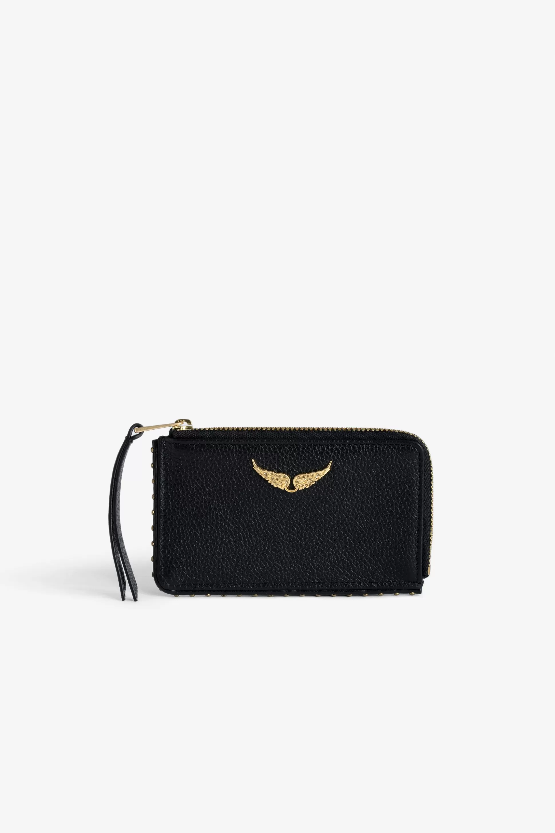 – Porte-Cartes Femme Zv En Cuir Grainé Noir Et Doré – Bordure Cloutée Et Charm Ailes Strassées Dorées – 4 Emplaceme…