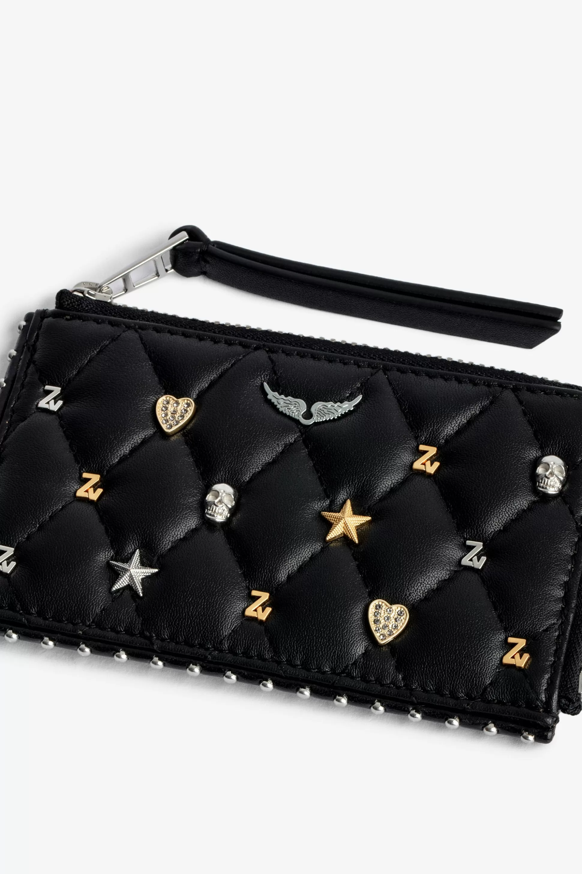 Porte-Cartes Femme En Cuir Matelassé Noir – 4 Emplacements Pour Cartes – Une Poche Plate – Une Poche Zippée – Charms A…