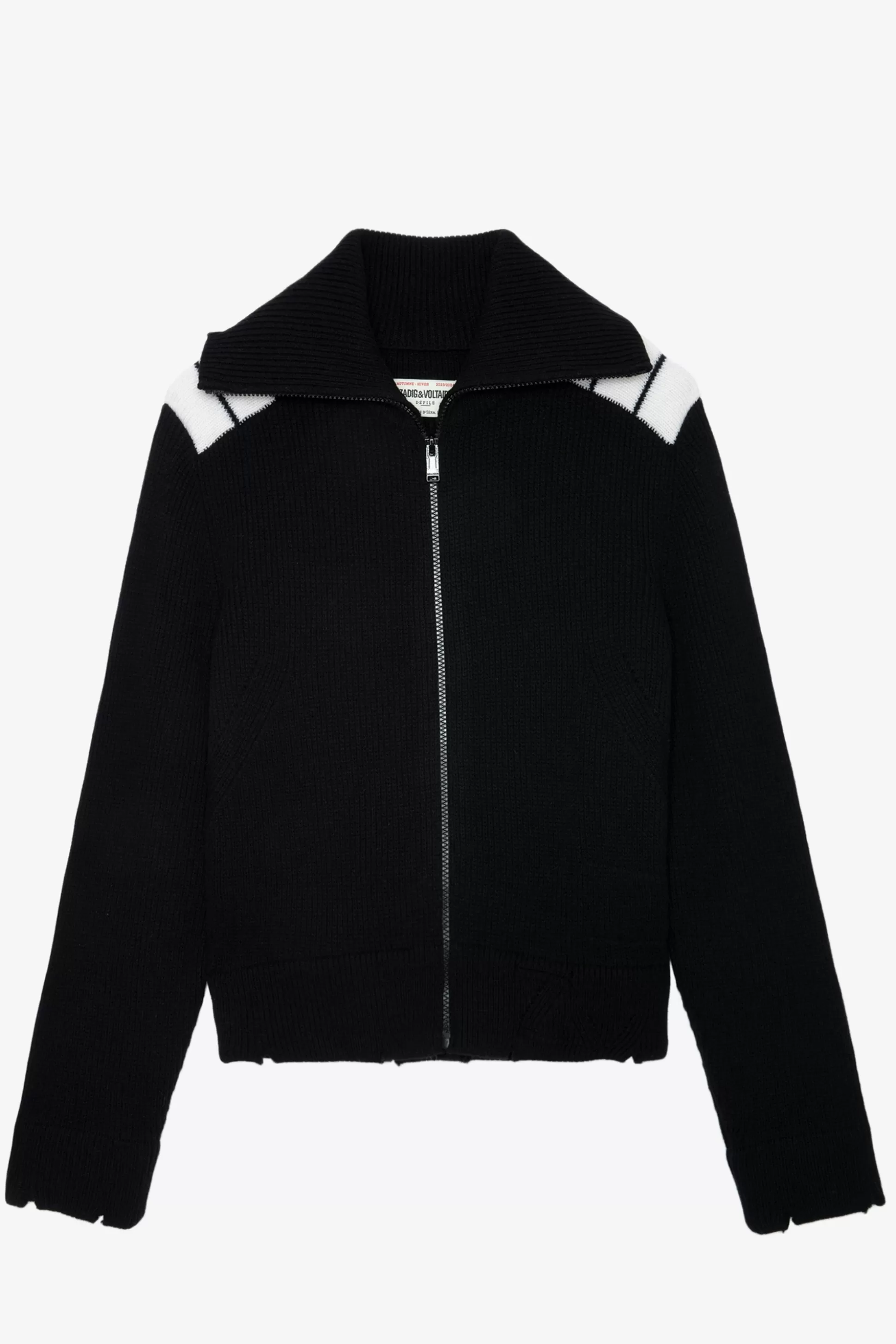 – Cardigan Femme Noir En Laine Mérinos – Col Montant Et Épaules Contrastées – Fermeture Zippée – Détails Surpiqués…
