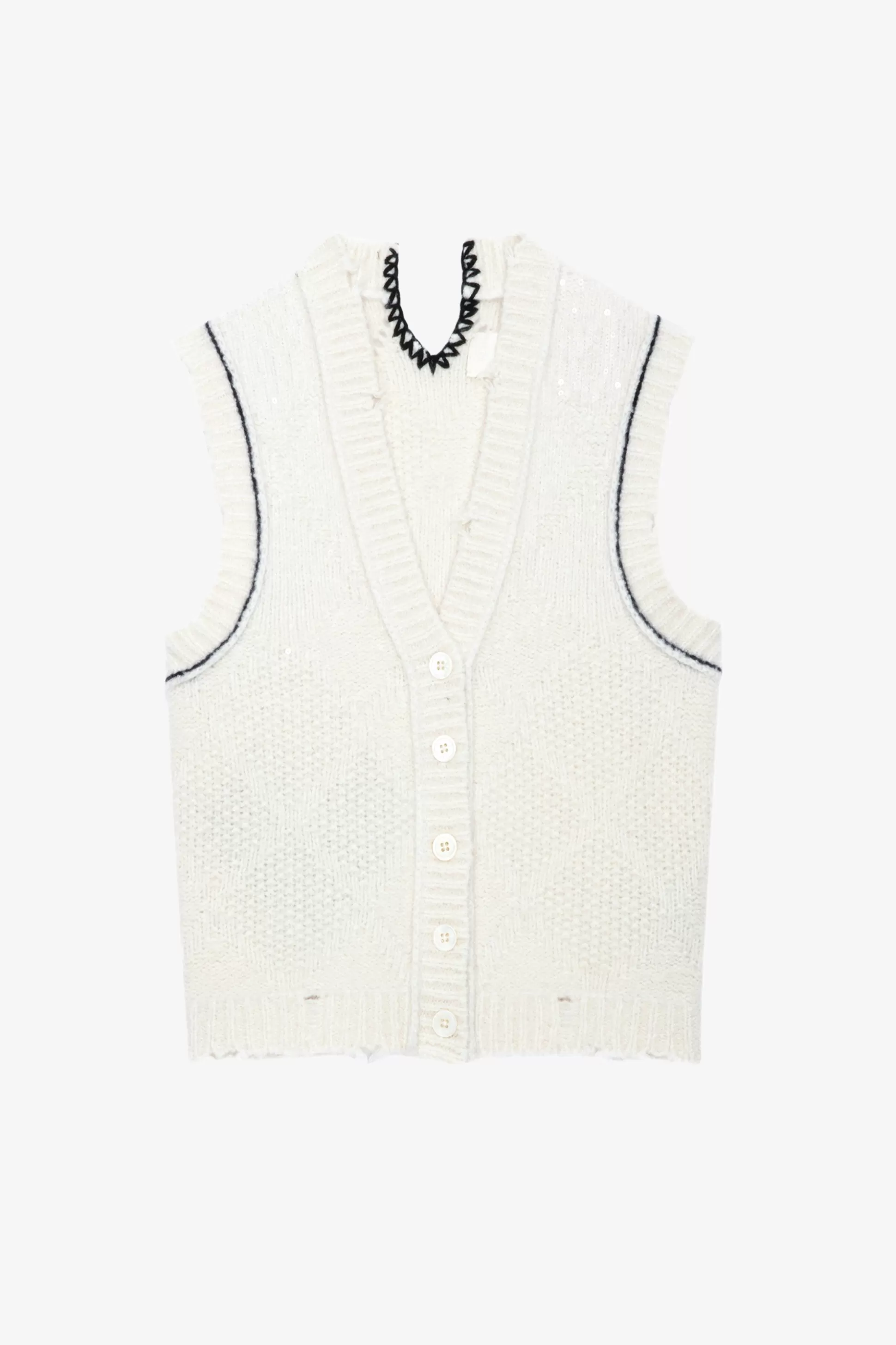 – Cardigan Sans Manches Femme En Maille Écru – Décolleté V Devant Et U Au Dos, Fermeture Boutonnée – Bordure Contras…
