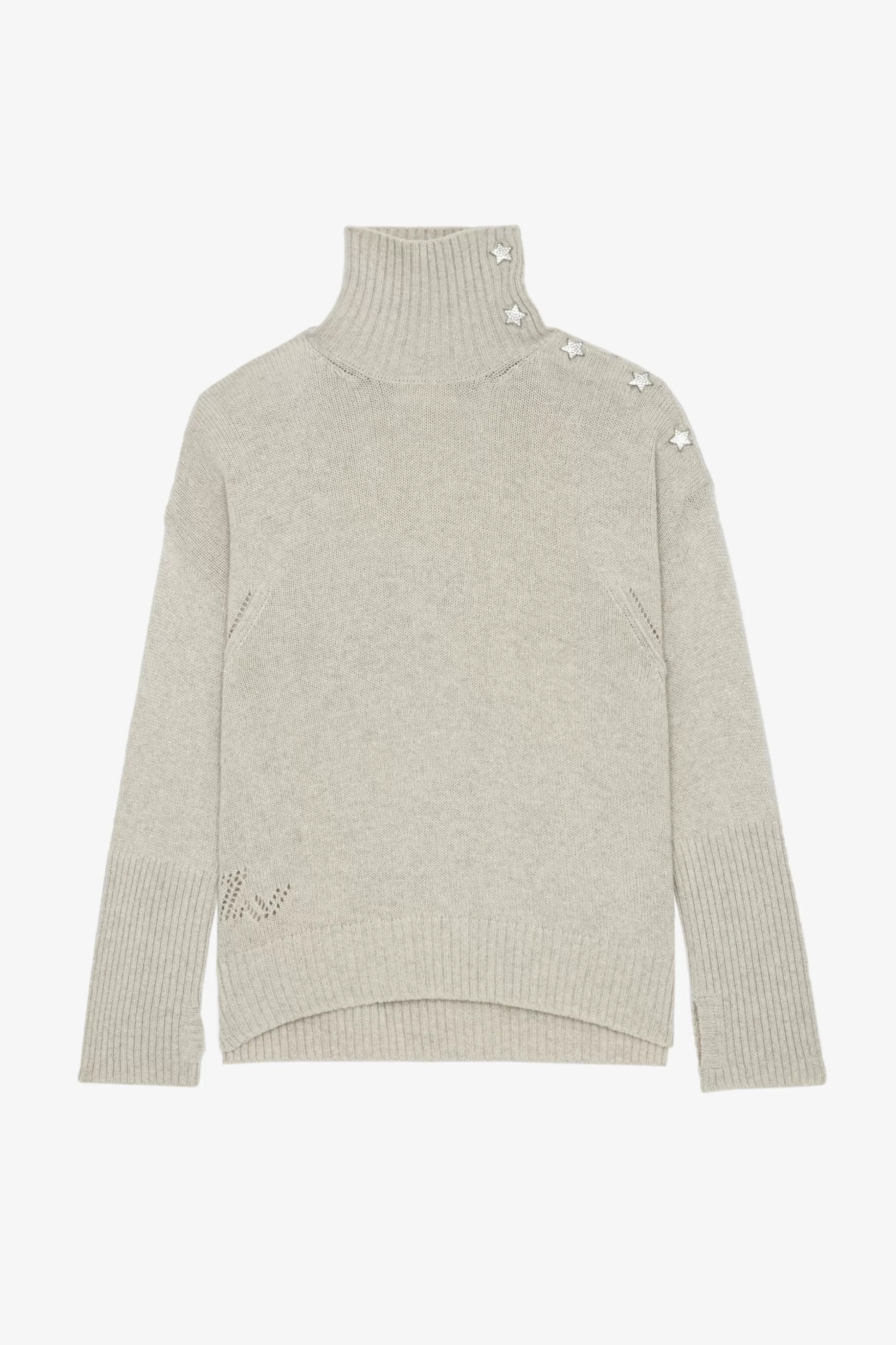 Pull Femme Mastic En Cachemire Écru – Manches Longues – Col Montant – Col Et Poignets Côtelés- Boutons Bijoux Étoile…