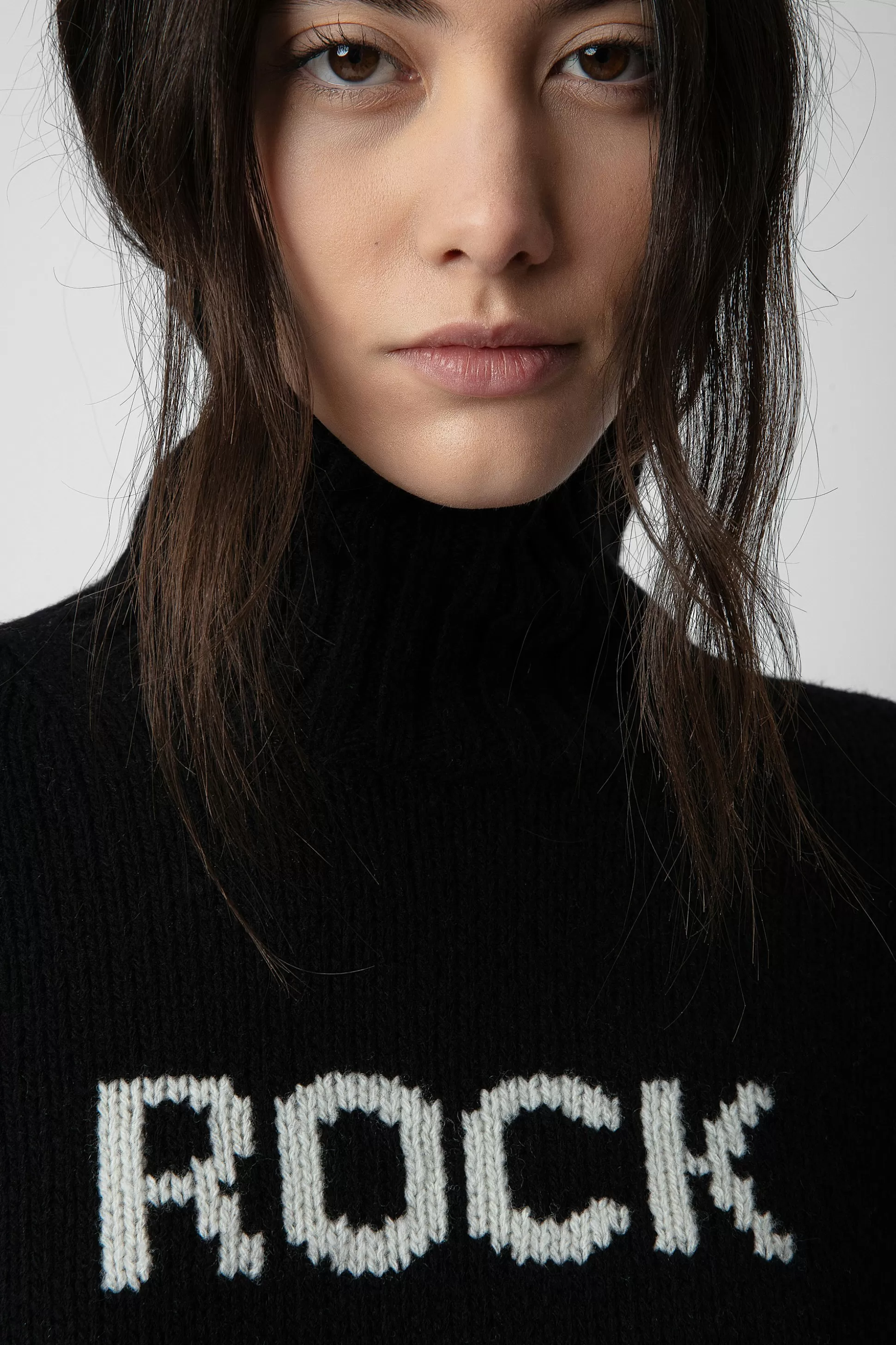 – Pull Femme Noir En Laine Mérinos – Col Montant – Manches Longues – Slogan « Rock & Roll » Devant – Col, Poignets Et…