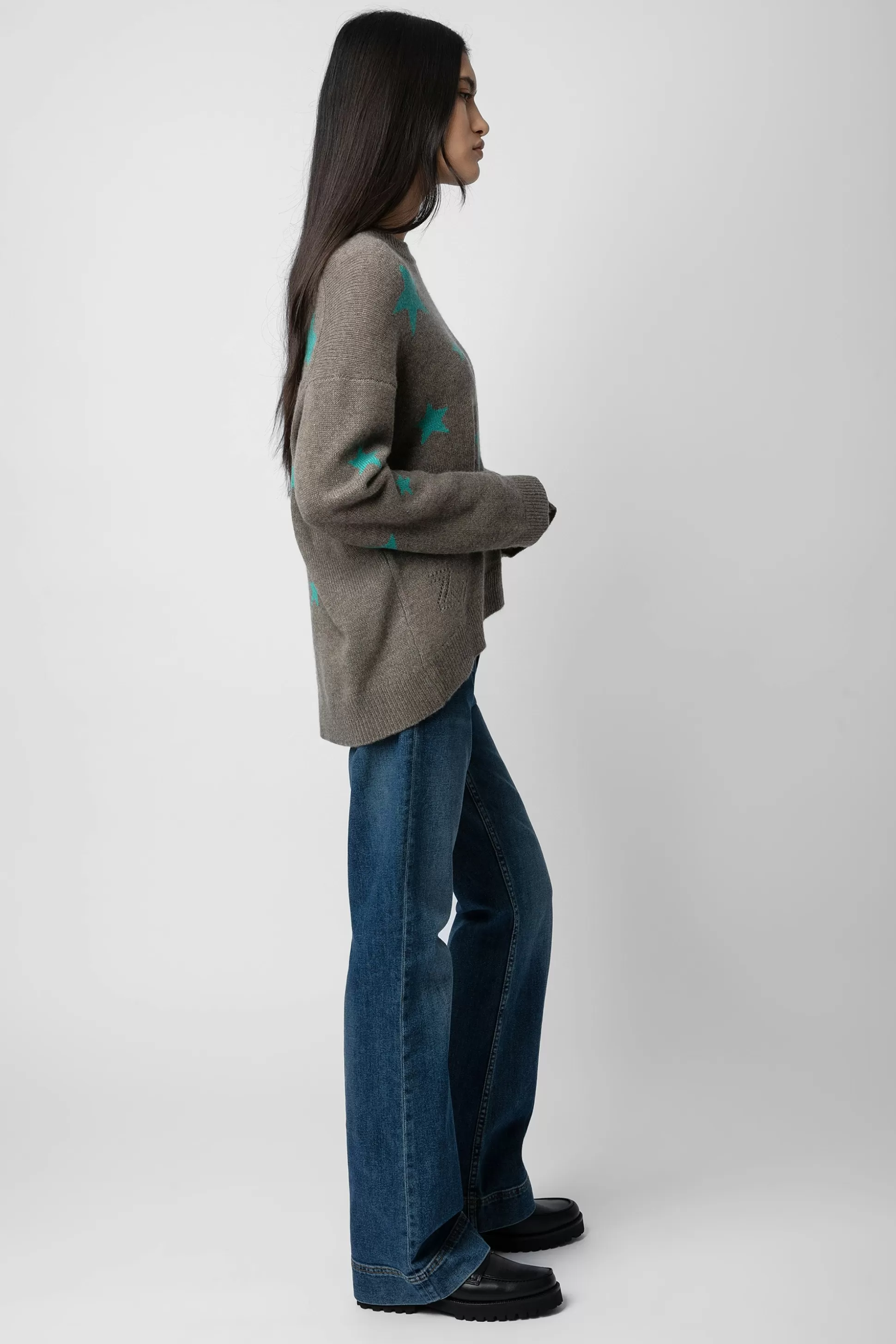 – Pull Femme En Cachemire Taupe Foncé- Motifs Étoiles Contrastées- Col Rond- Manches Longues Et Bords-Côtes