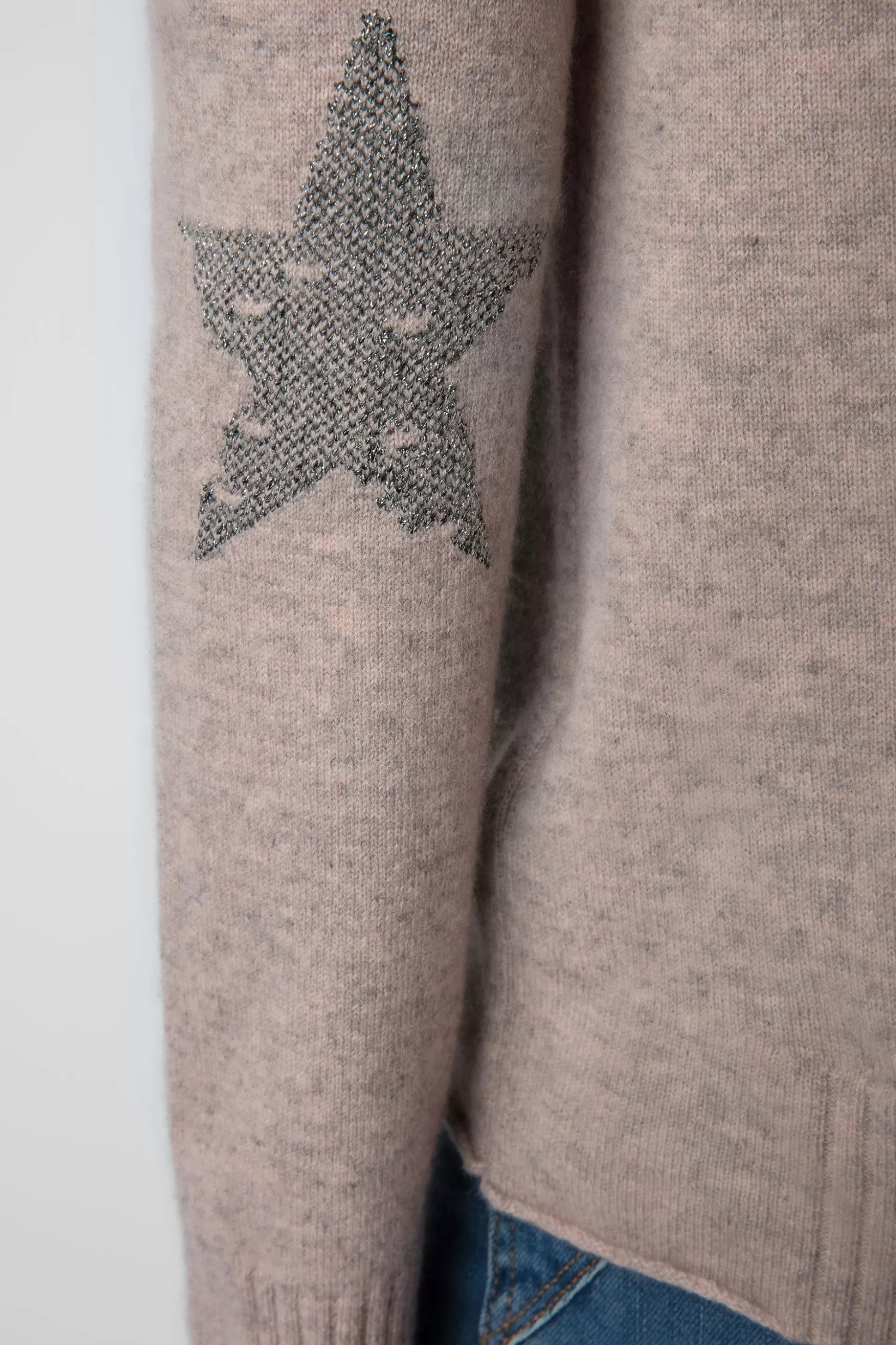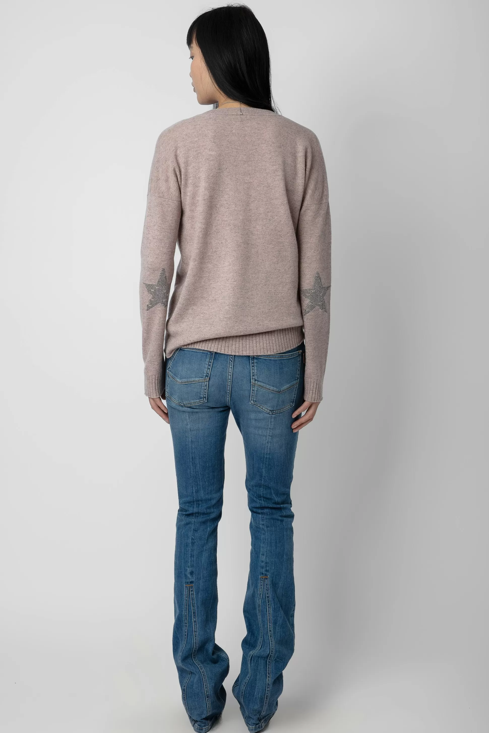 Pull Femme En Cachemire Rose Primerose – Coudières Étoiles Contrastées Effet Destroy – Col V – Manches Longues, Signa…