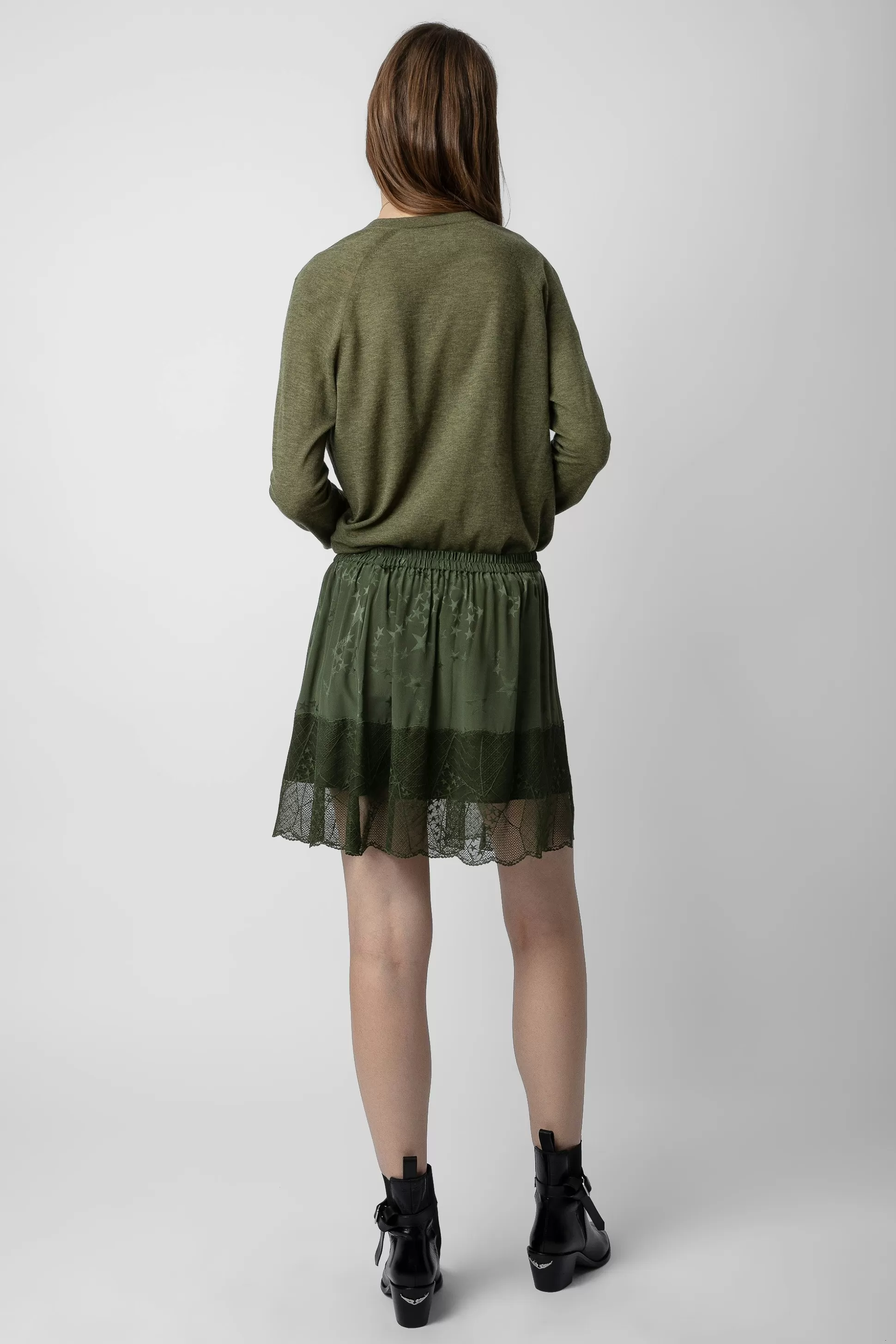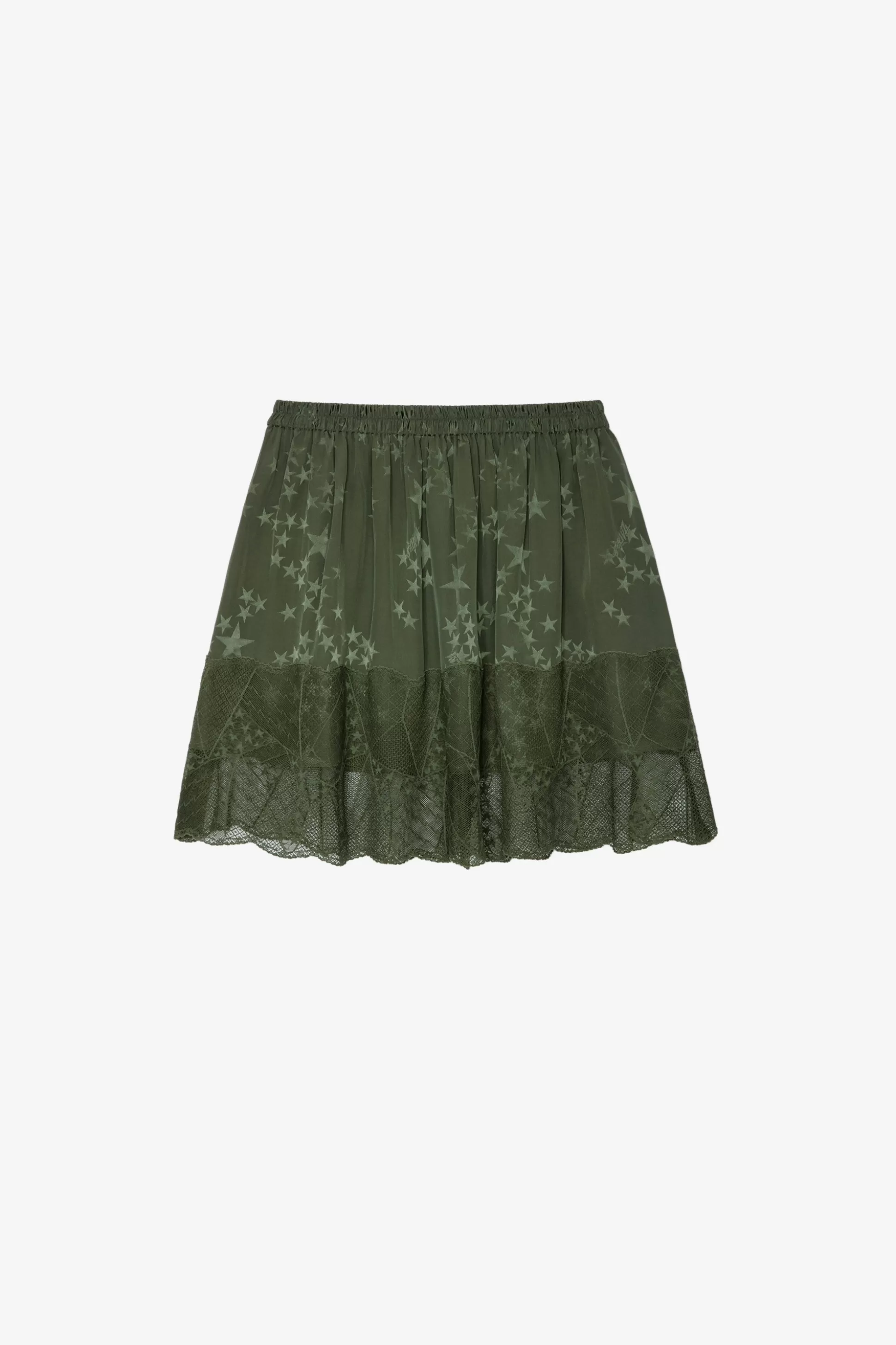 – Jupe Courte Esprit Lingerie Kaki – Soie Imprimé Jacquard Étoiles Et Bordure En Dentelle – Fronces – Taille Élastiqu…