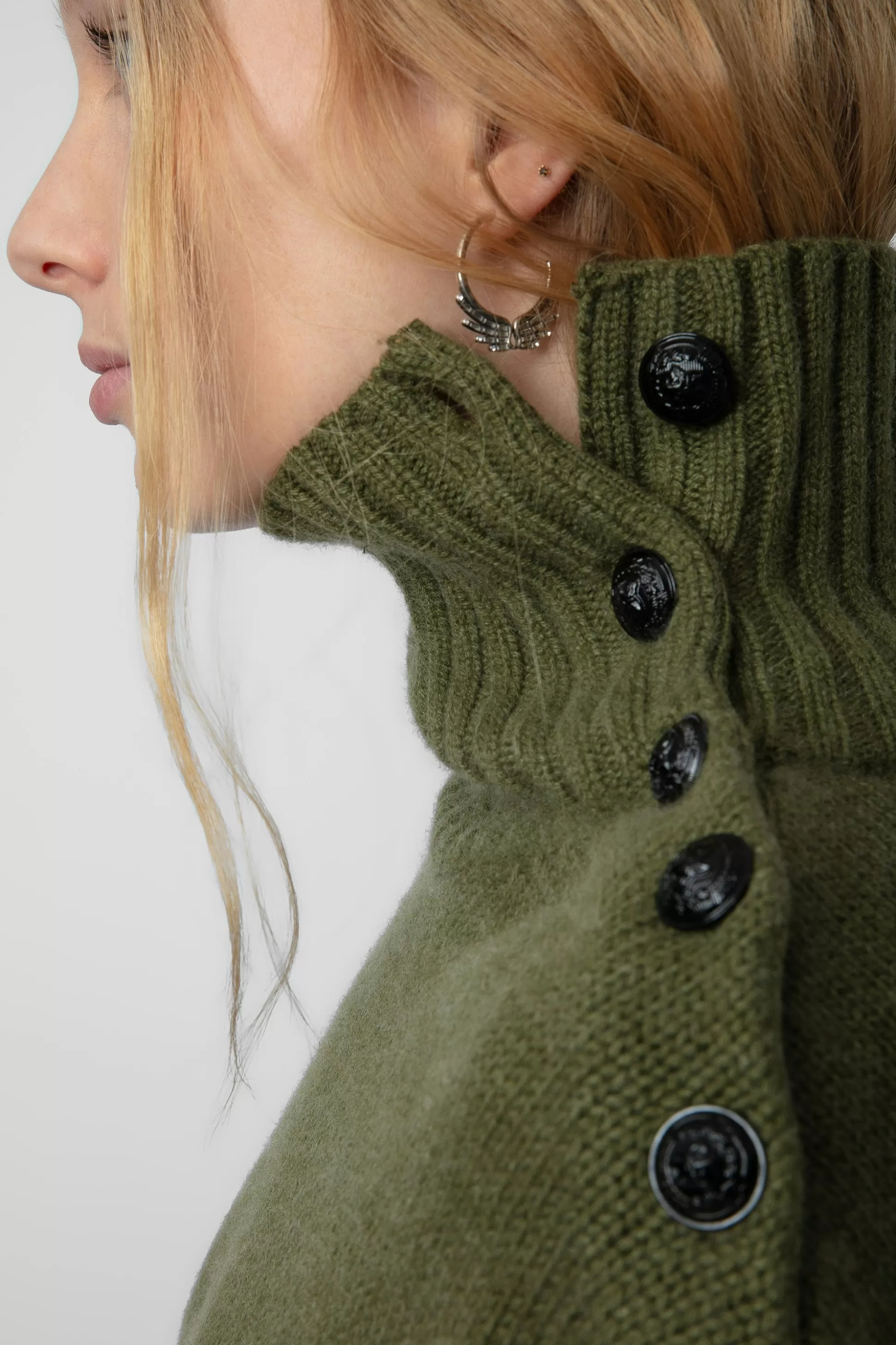 Robe Courte Femme En Cachemire Kaki Dark Olive – Col Roulé Et Boutons Sur L’Épaule – Manches Longues, Passe-Pouces Et …
