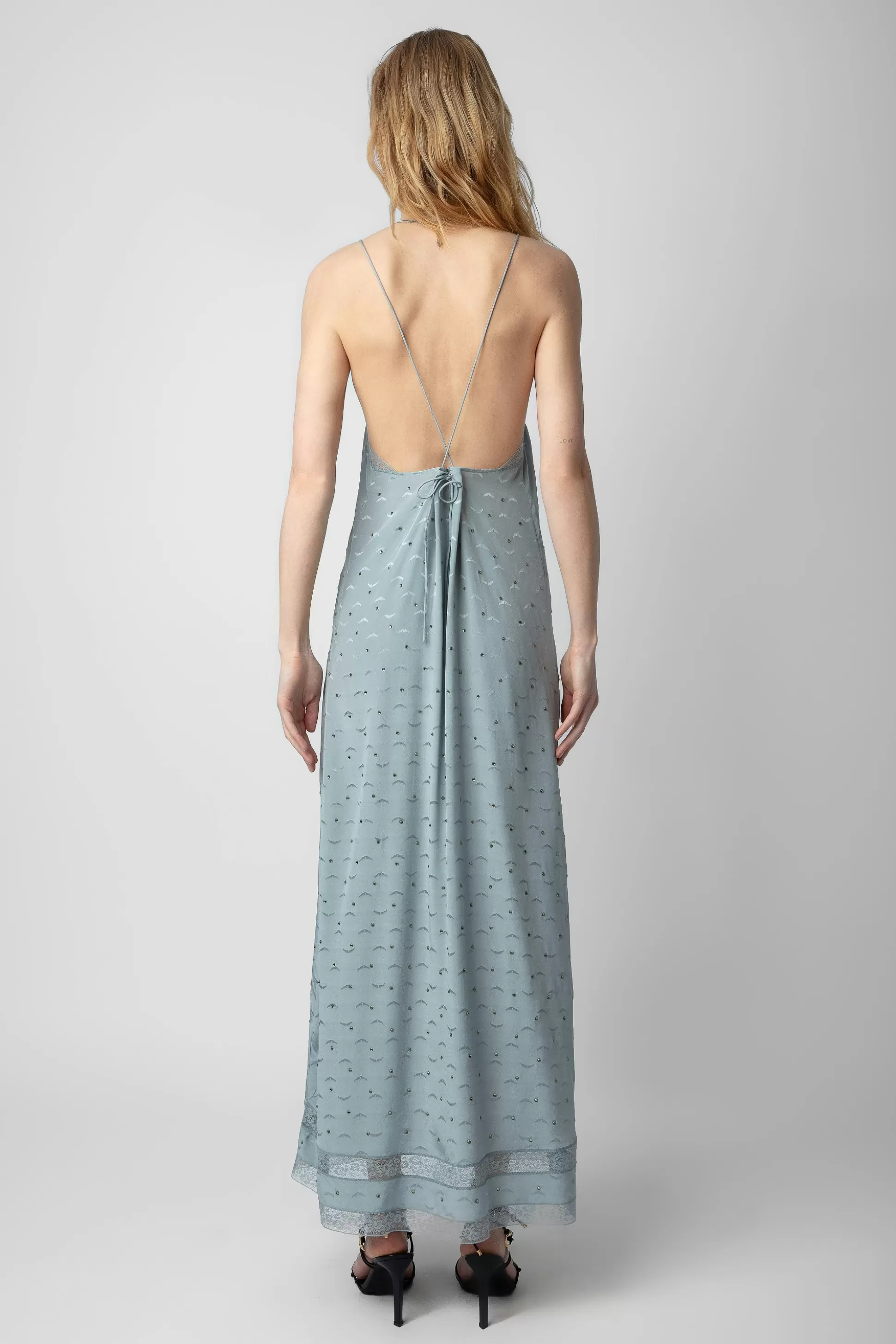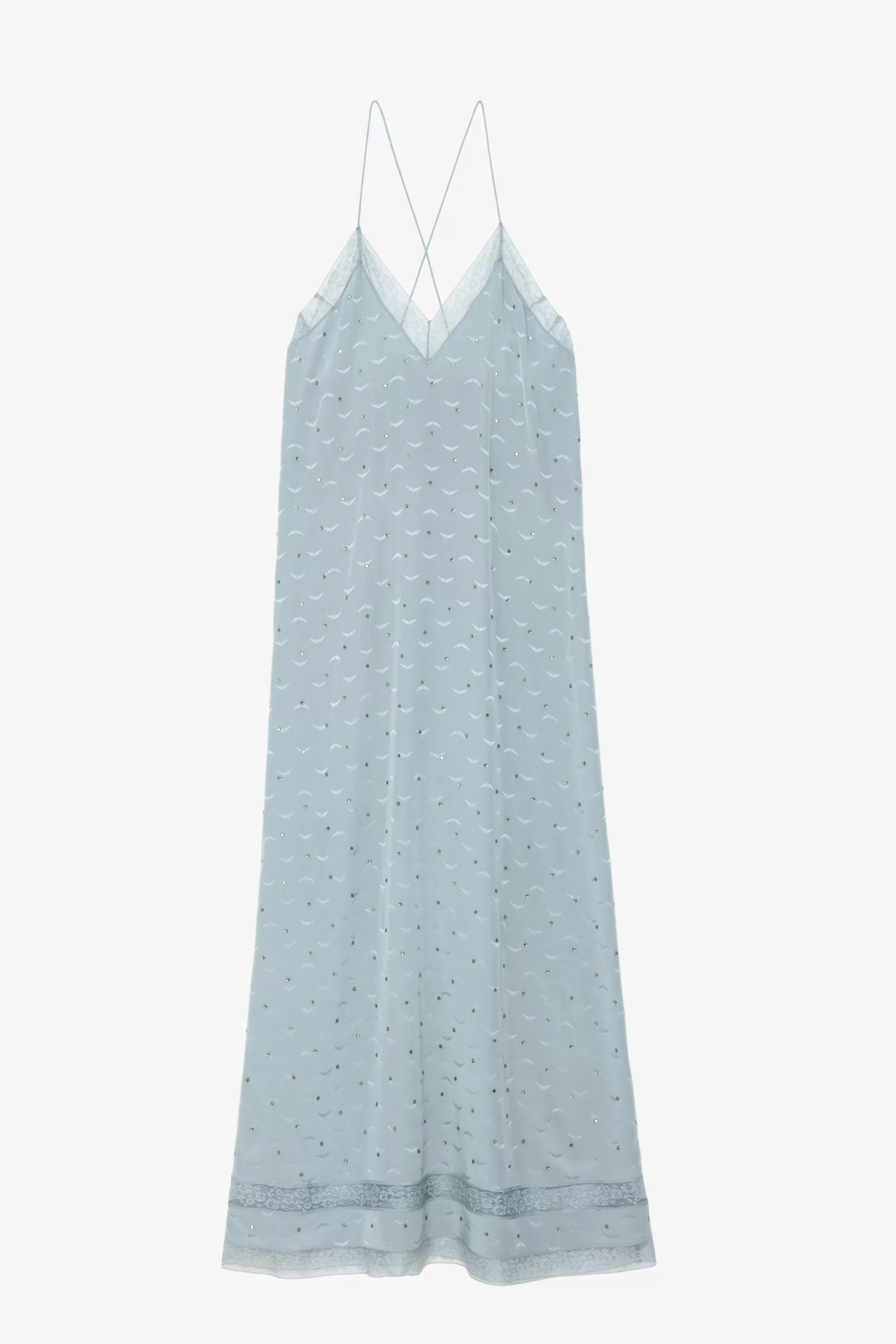 Robe Longue Style Lingerie Femme Glacier Bleu Ciel – Soie Avec Ailes Jacquard Et Strass En Verre – Décolleté En V Et B…