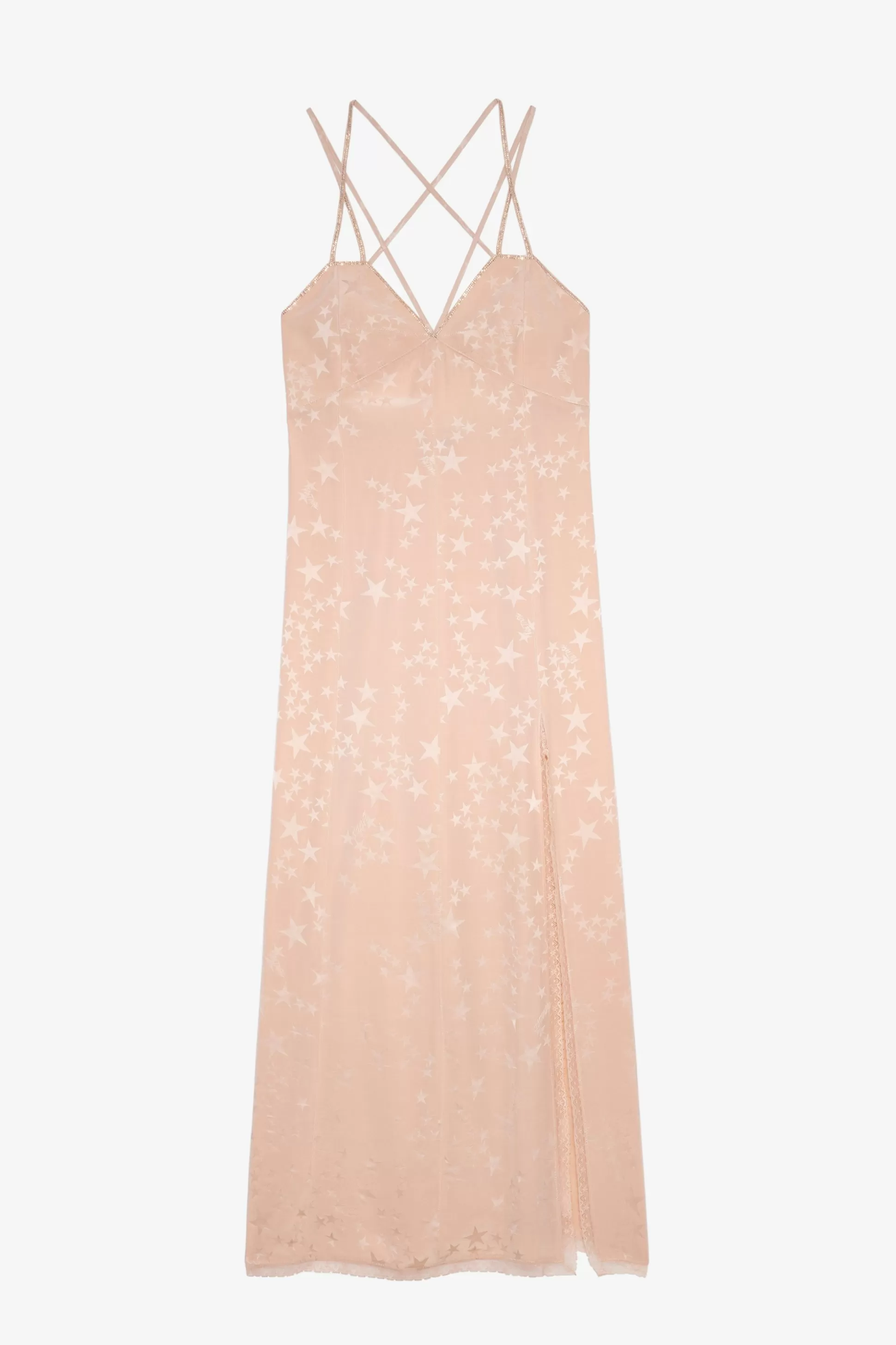 Robe Longue Fluide Ballerine Rose Femme – Jacquard De Soie Imprimé Étoiles – Décolleté En V Et Fines Bretelles Crois…