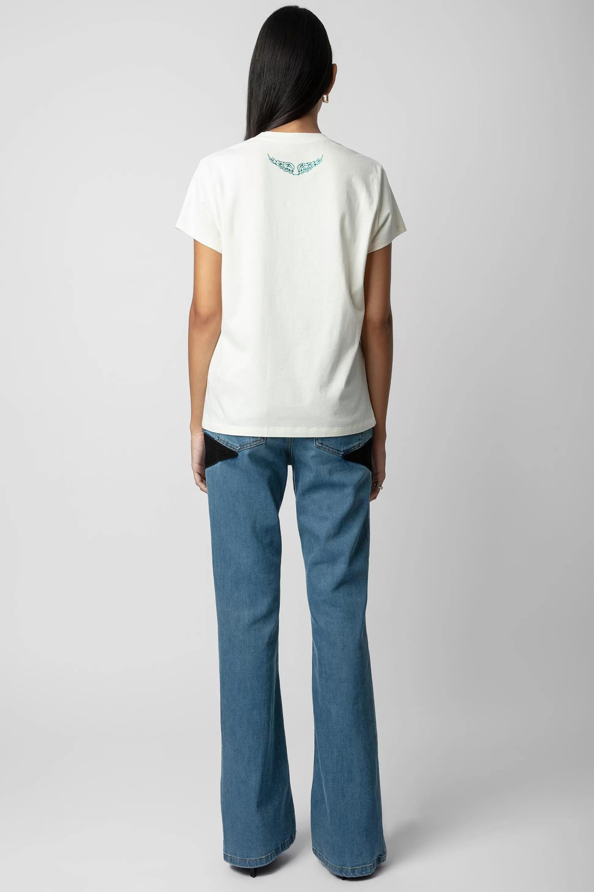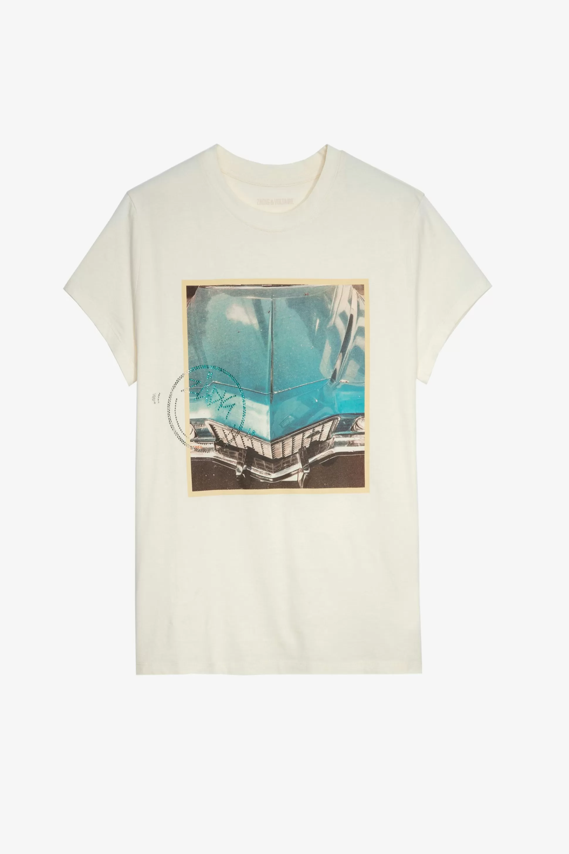 – T-Shirt Femme Blanc Cassé En Lin Et Coton – Imprimé Photo Blue Car Et Zadig Happy Face Devant Et Ailes Diamantées A…