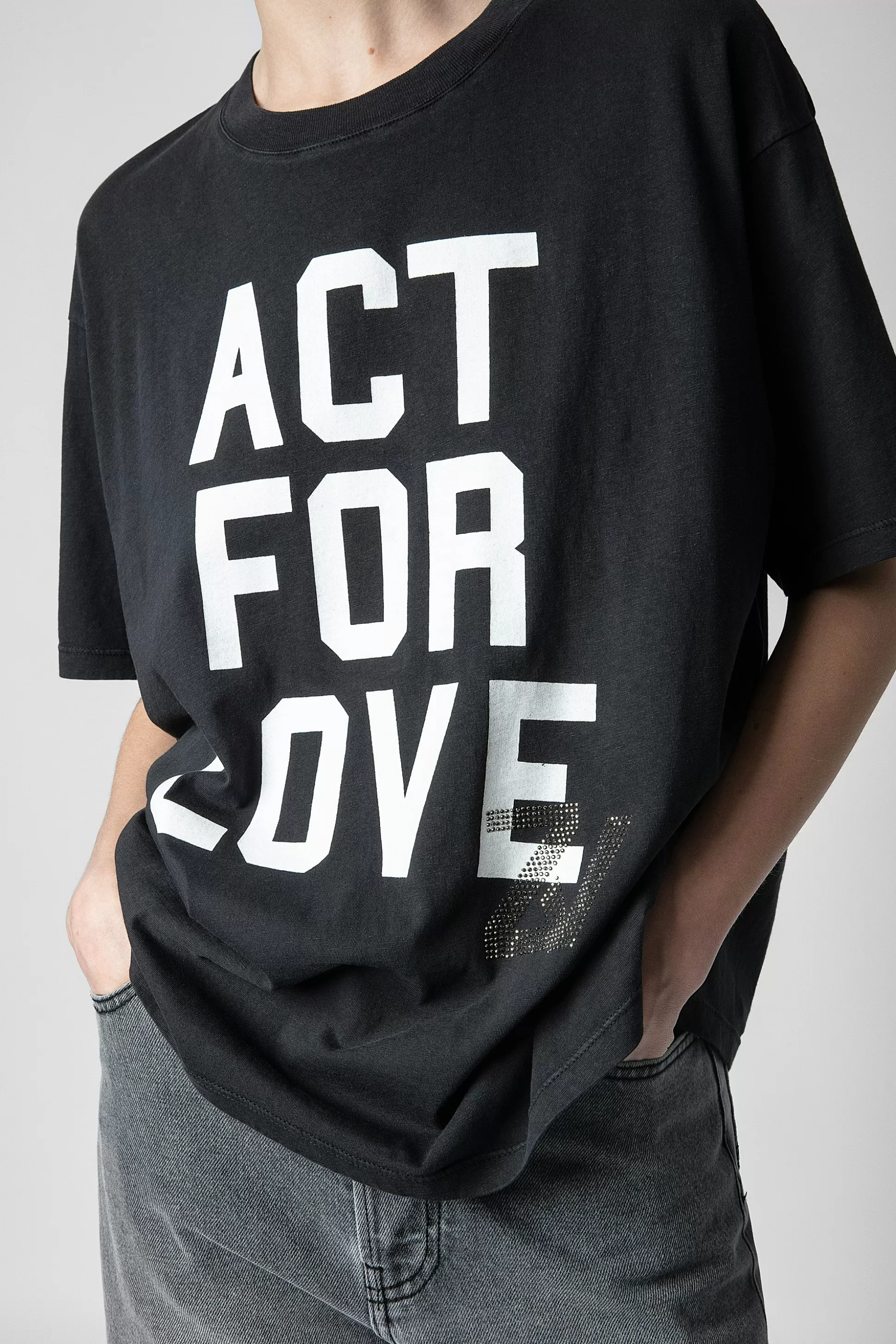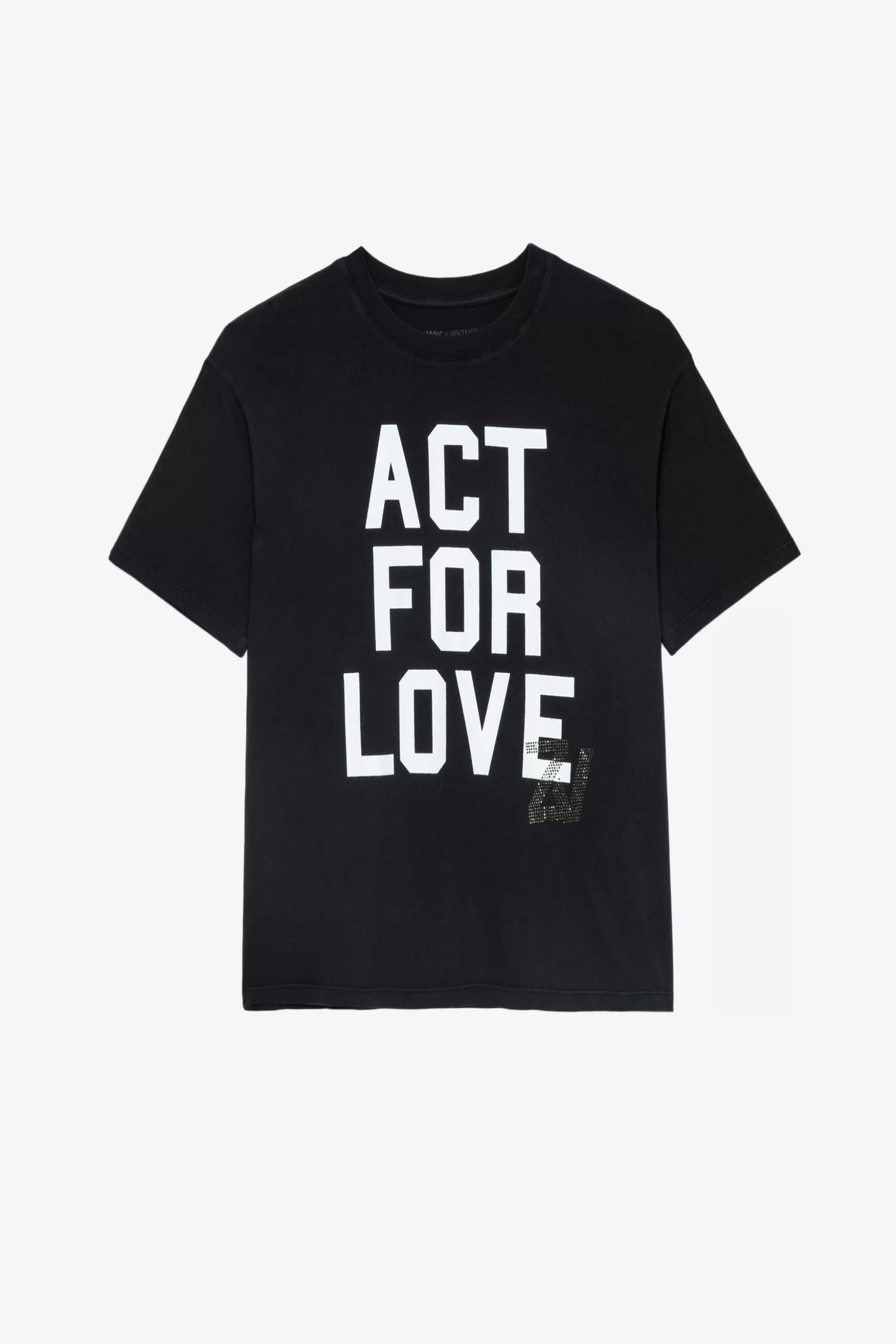 Doté D’Un Col Rond Côtelé Et De Manches Courtes Évasées, Ce T-Shirt Décontracté En Coton Arbore Un Slogan « Act For Love » Clouté De Strass Accentué Par Un Zv Sur Le Devant.