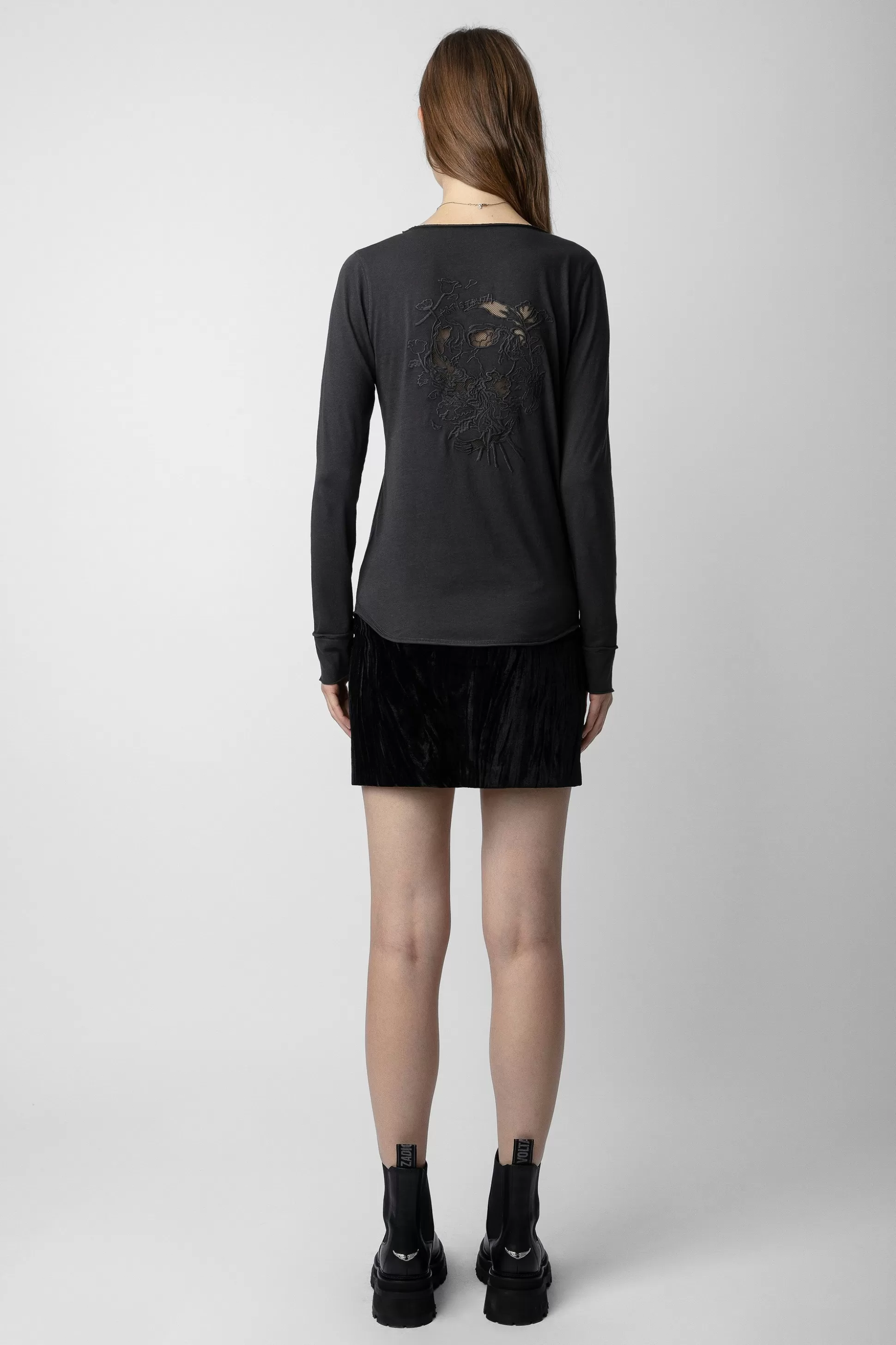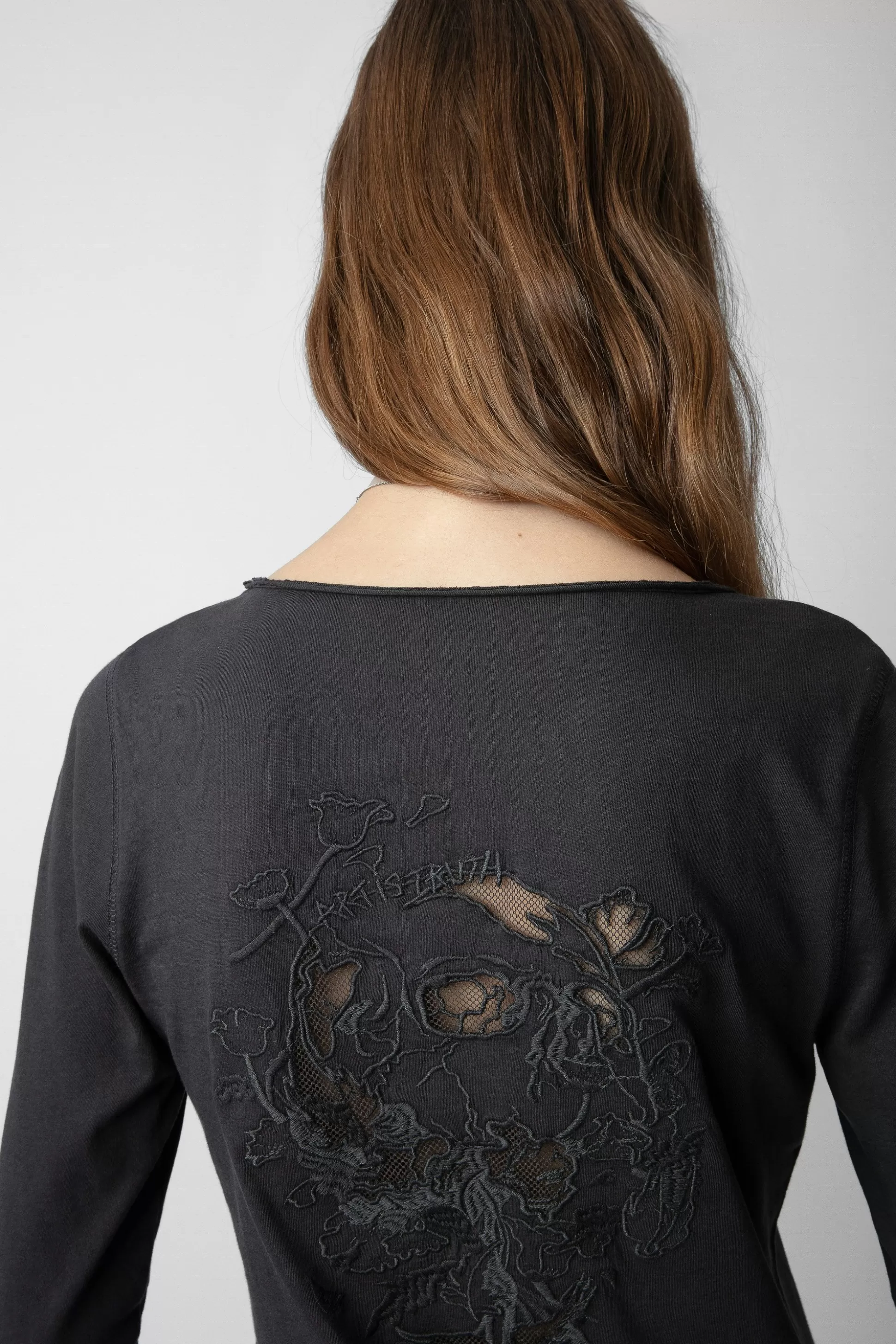 T-Shirt Femme En Coton Gris Carbone – Col Henley Avec 5 Boutons – Manches Longues – Broderie Fleurie Et Tête De Mort Au…