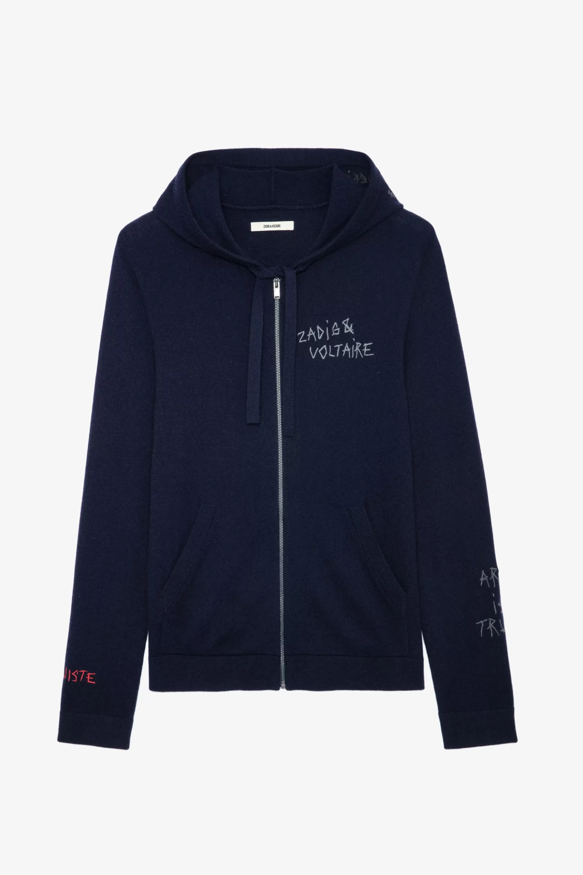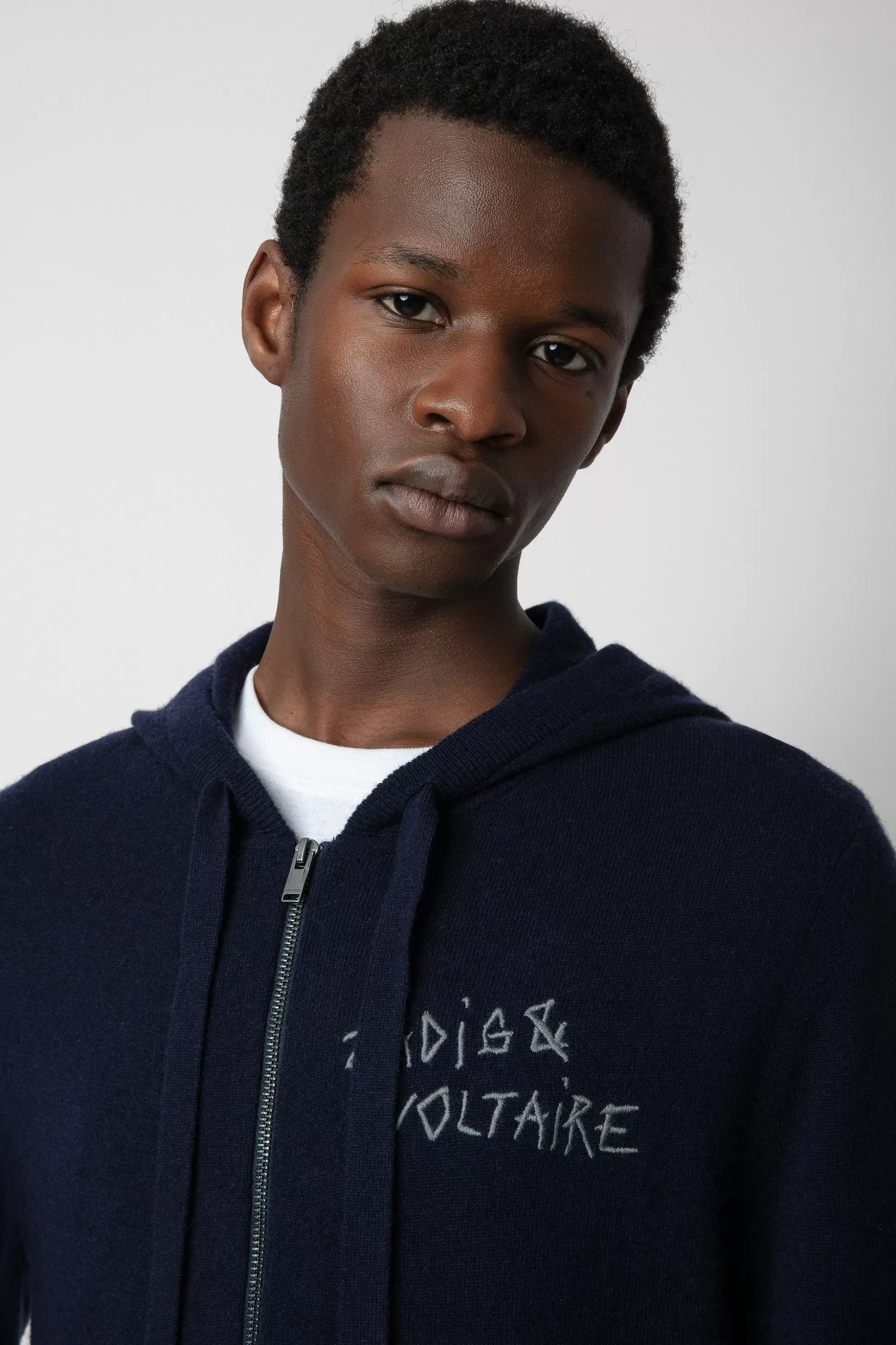 – Cardigan En Maille Bleu Marine Encre – Capuche Avec Cordon De Serrage Et Fermeture Zippée – Slogans Signature Et Moti…
