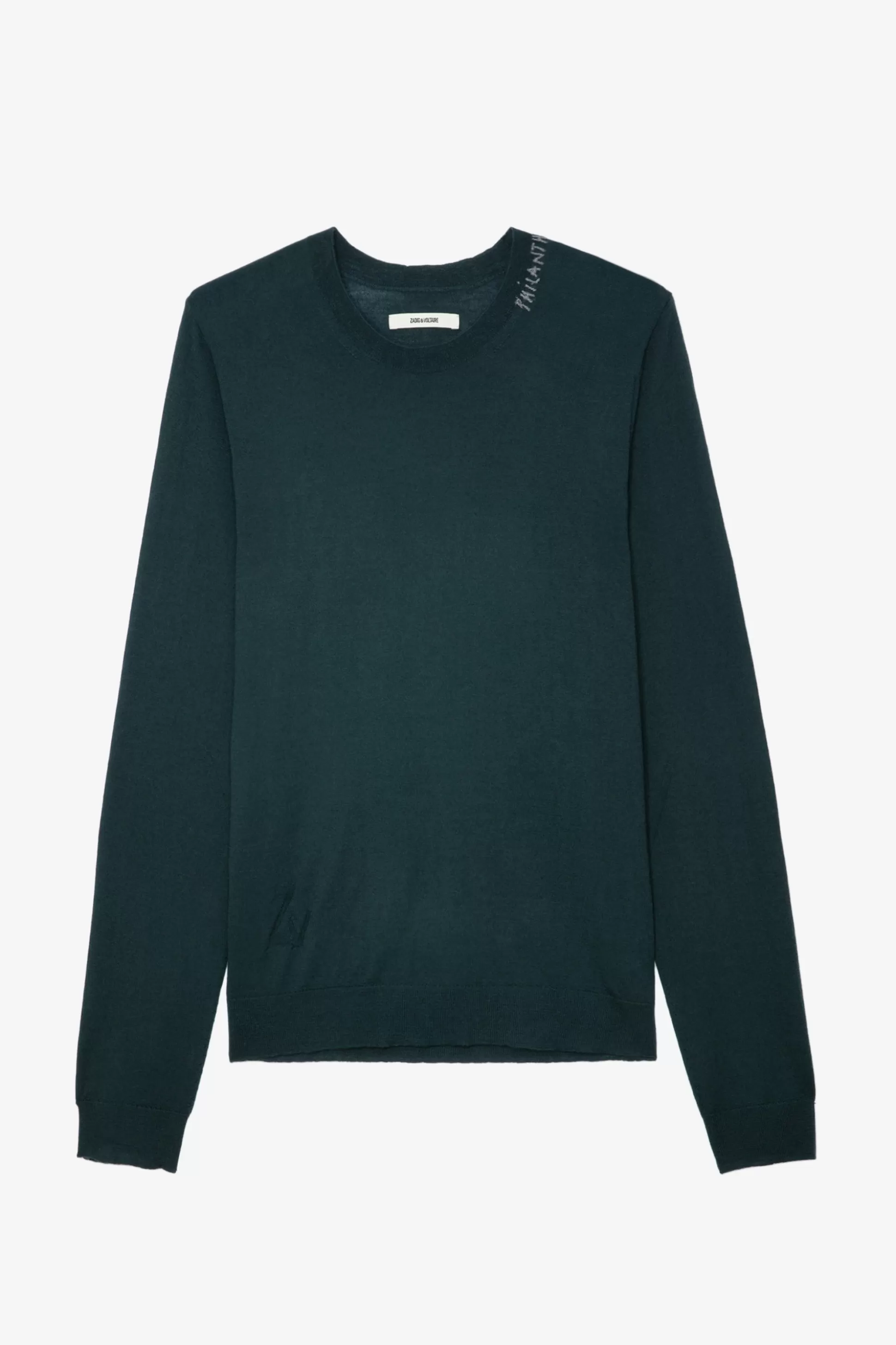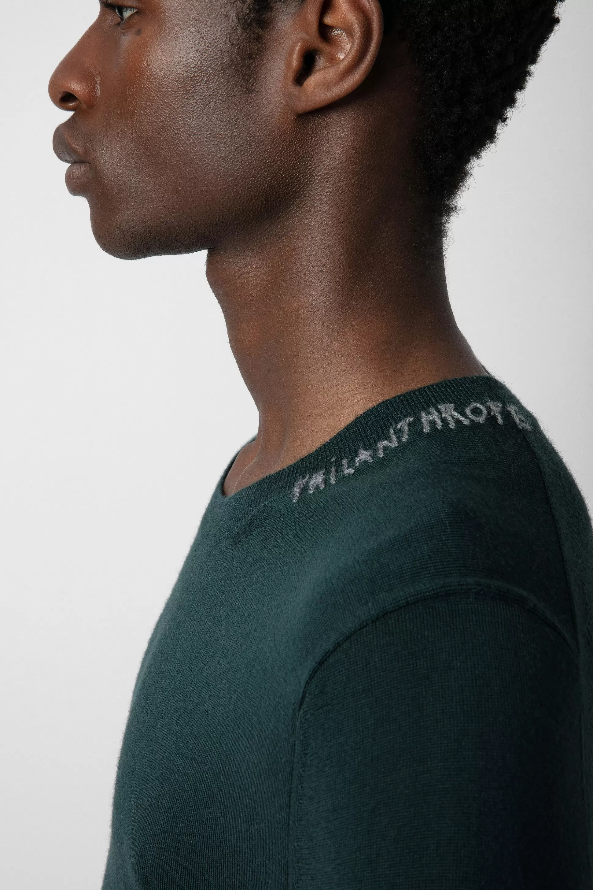 Pull Homme En Laine Mérinos Vert Lovat – Broderie « Philanthrope » Sur L’Encolure Et Signature Zv En Pointelle – Enco…