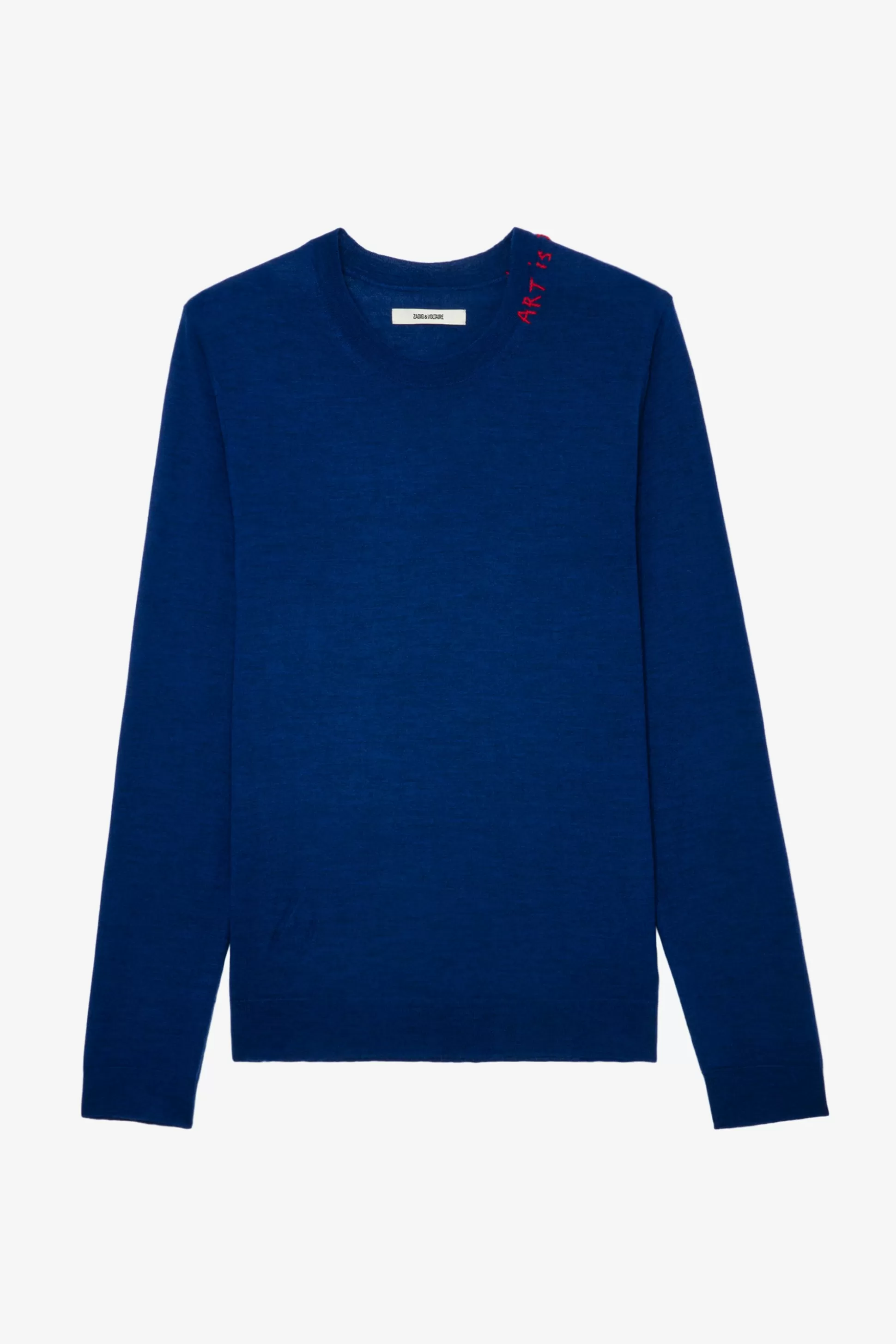 – Pull Homme En Laine Mérinos Bleu Roi – Broderie Contrastée « Art Is Truth » Sur L’Encolure Et Signature Zv En Poin…