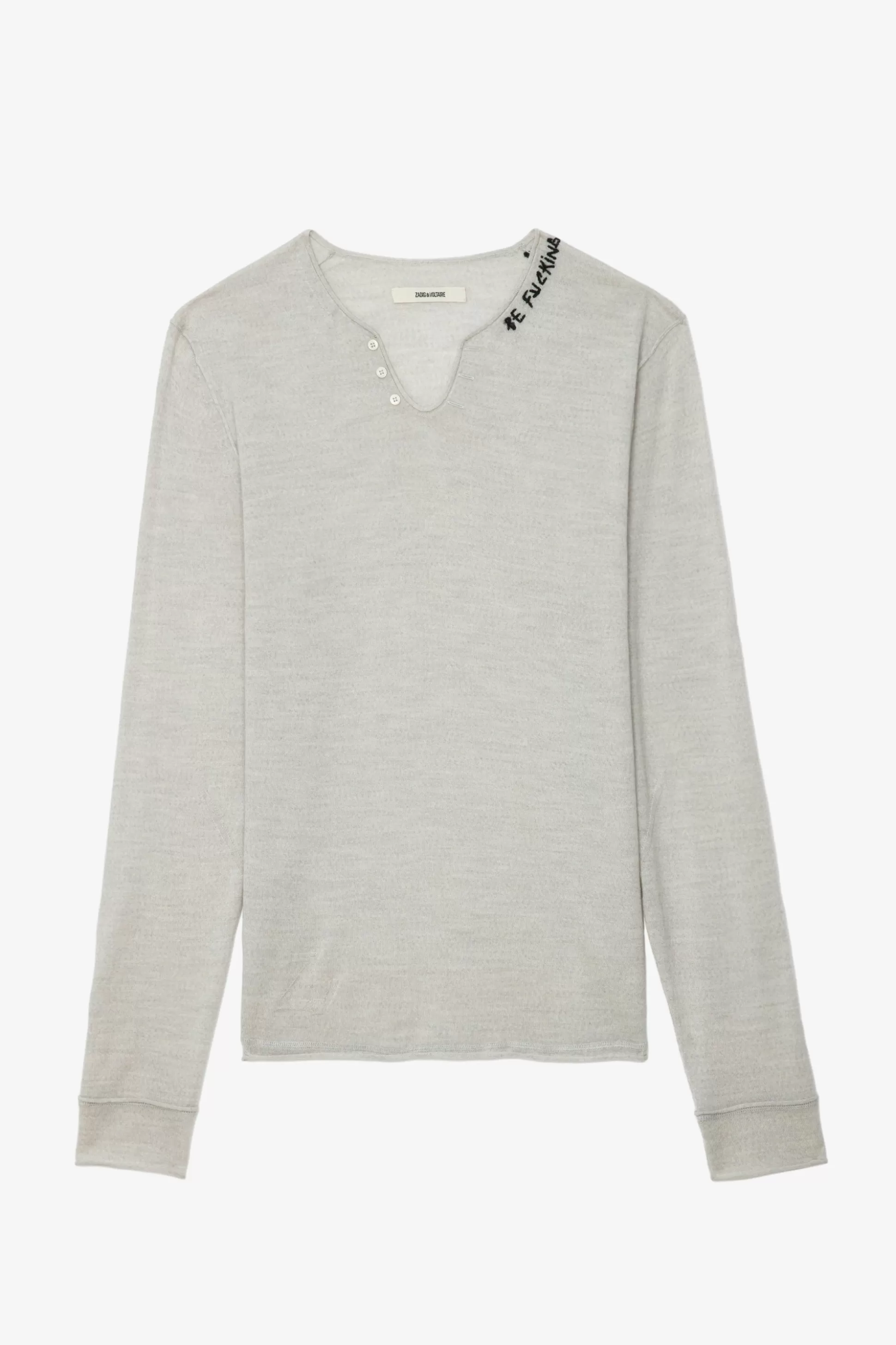 – Pull Homme Snow En Laine Mérinos Gris Clair – Col Henley 3 Boutons Et Broderie « Be Fucking Nice » – Broderie Zv To…
