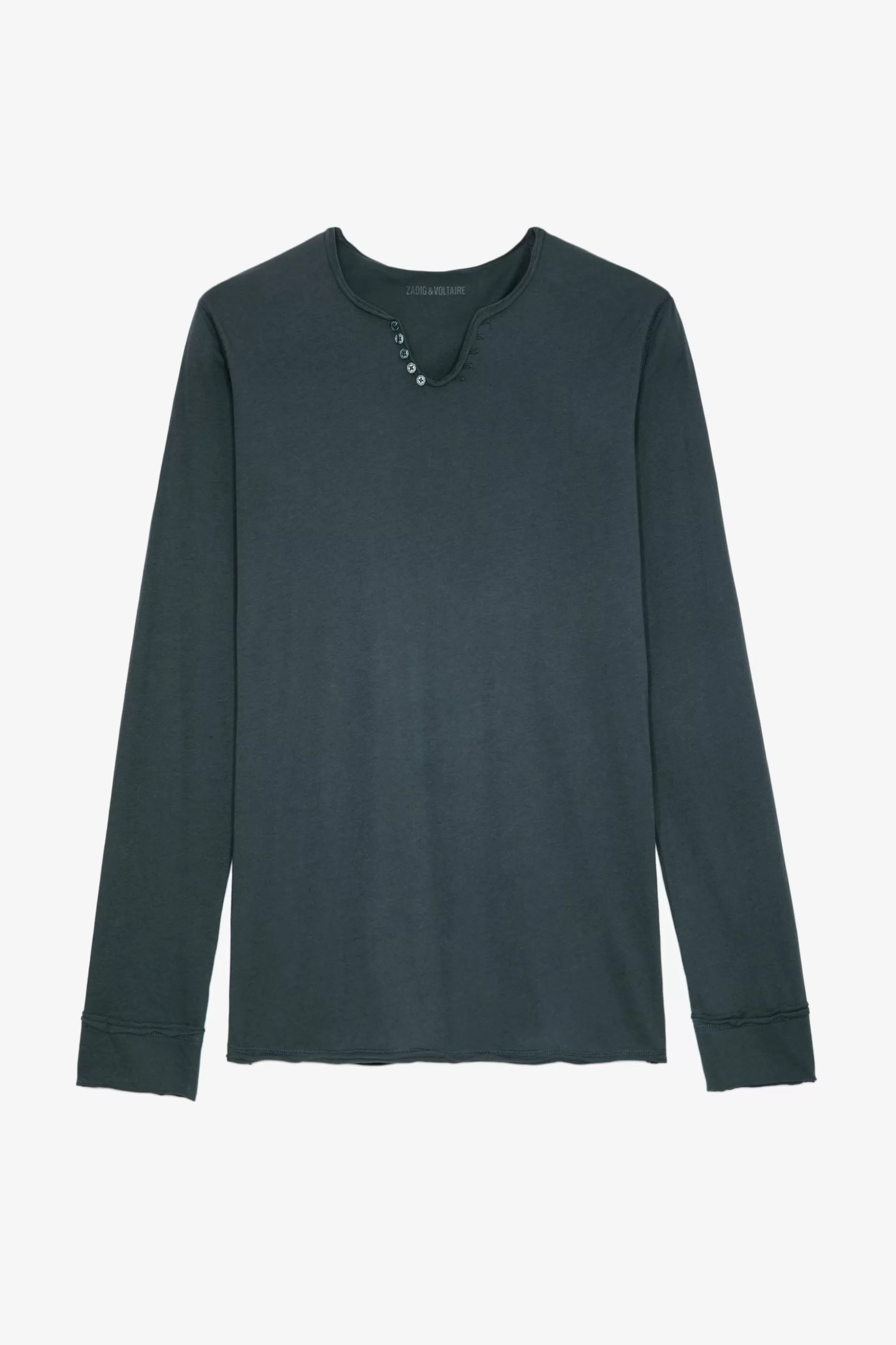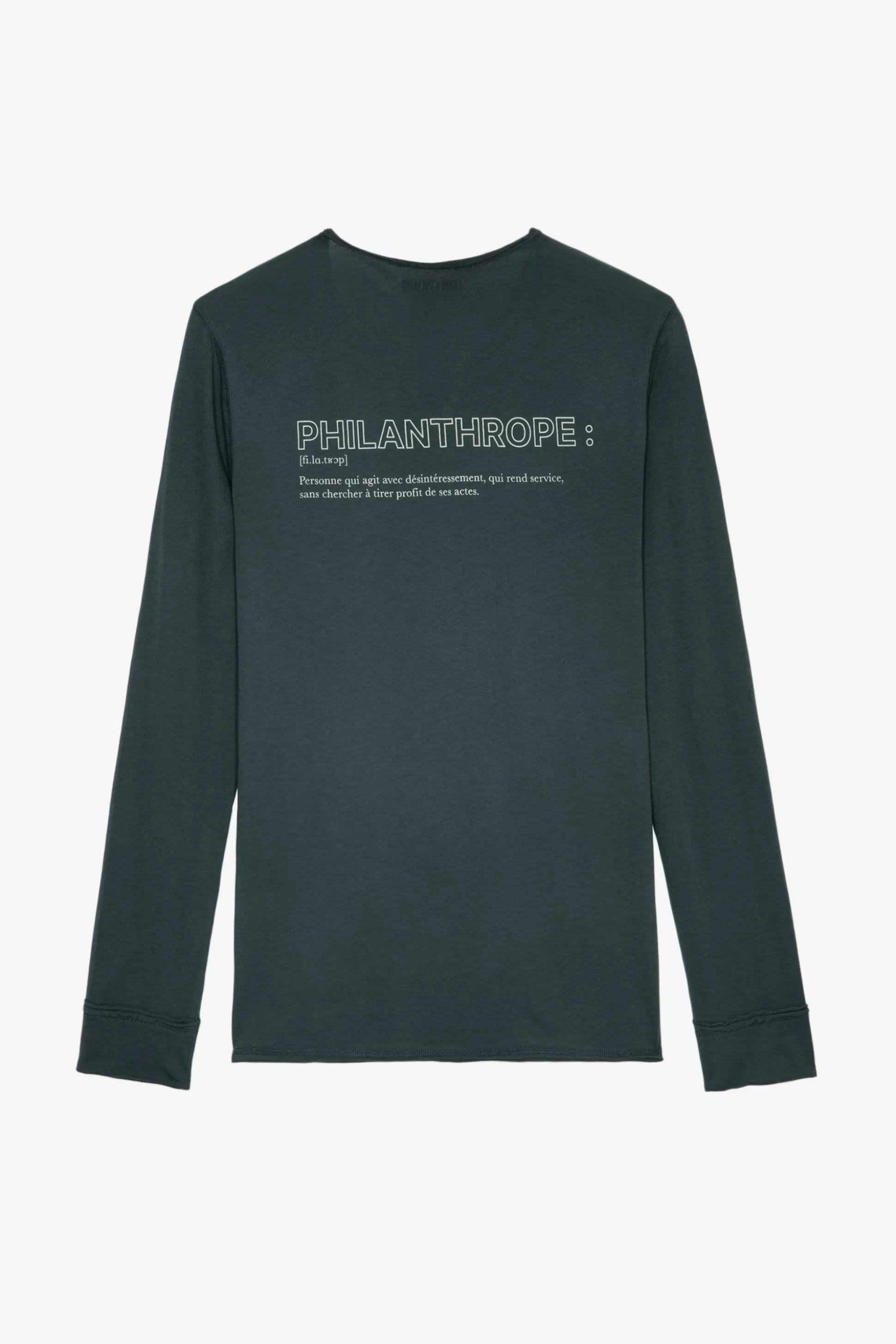 – T-Shirt Homme En Coton Vert Lovat – Imprimé Définition Philanthrope Au Dos – Col Henley Avec 5 Boutons – Manches Lon…