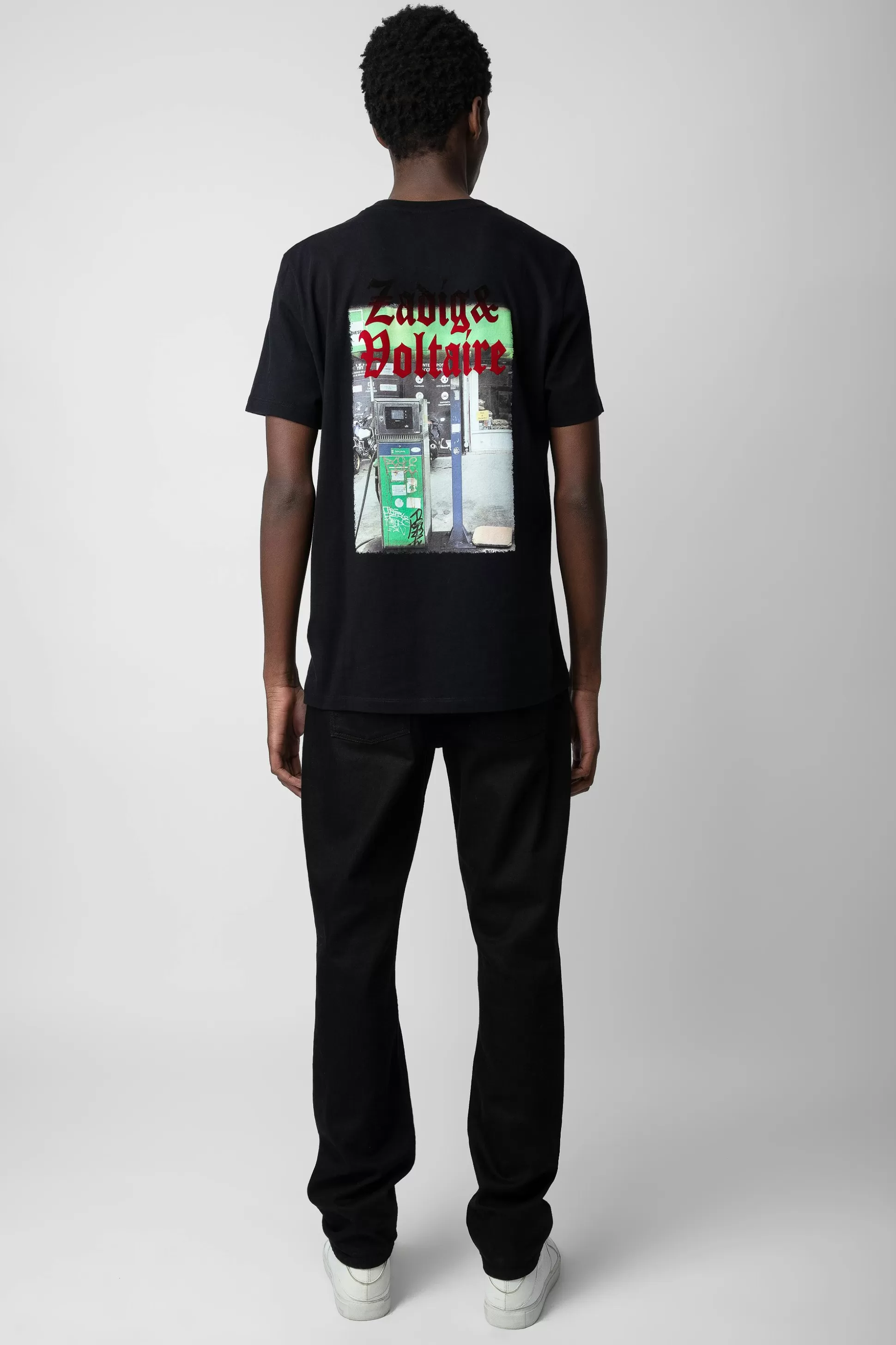 – T-Shirt Homme En Coton Noir – Impression Photo Station-Service Au Dos – Col Rond Et Manches Courtes – Fabriqué Au Por…