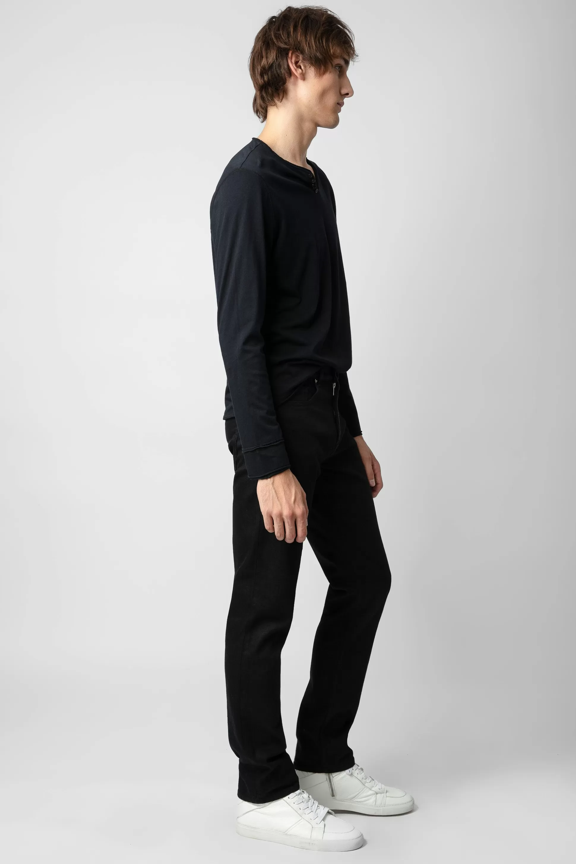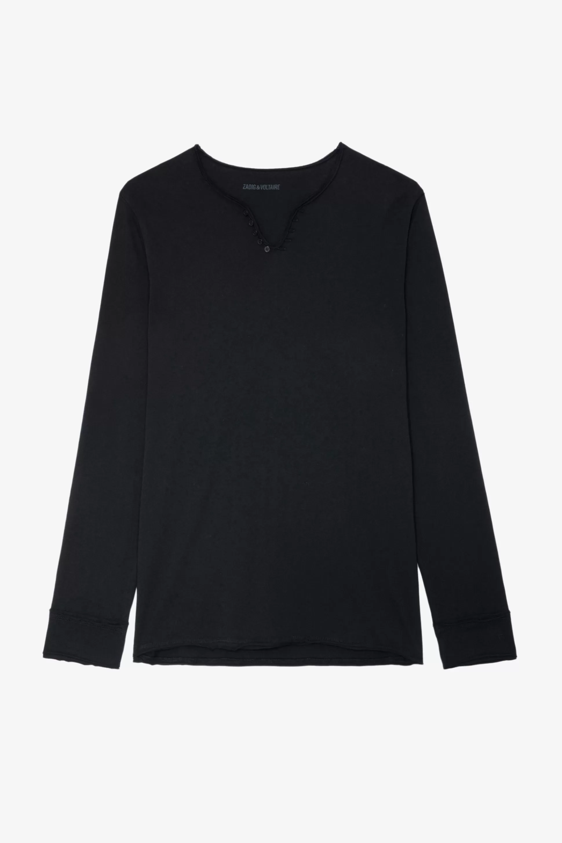 – T-Shirt Homme En Coton Noir – Photo De Voiture Imprimée Au Dos – Col Henley Avec 5 Boutons – Manches Longues – Fabriq…