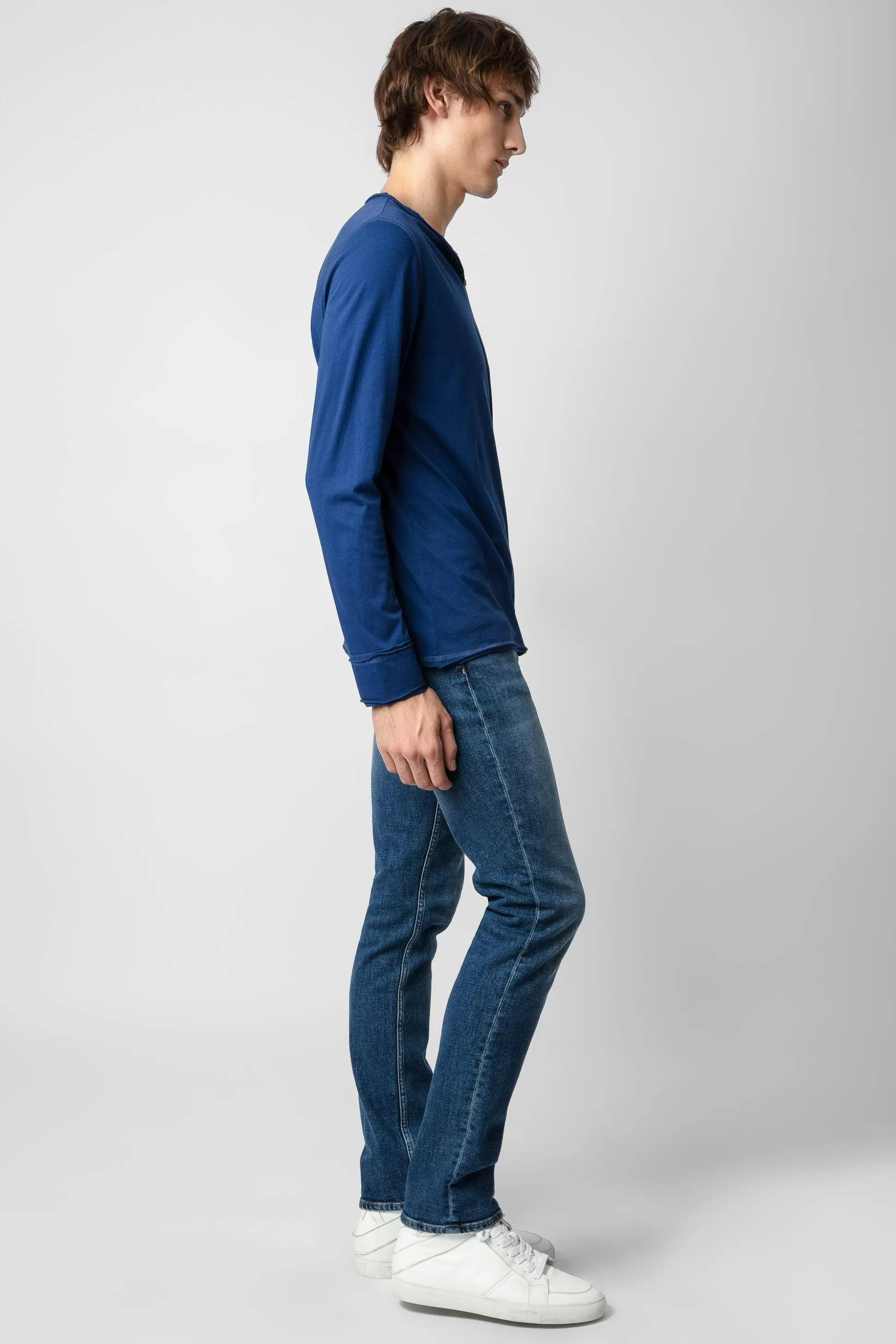 – T-Shirt Homme En Coton Bleu Roi – Col Henley À 5 Boutons – Manches Longues – Fabriqué Au Portugal